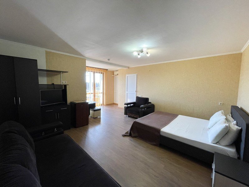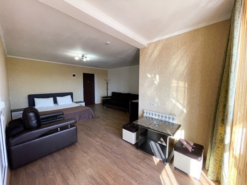Семейный номер с балконом– это номер с пятью спальными местами - двуспальной кроватью, двуспальным диваном и креслом кроватью. Напольное покрытие - ламинат. Расположение номеров - пятый этаж. В номере имеется холодильник, телевизор, кондиционер сплит-система, фен. В номере собственный санузел, в котором есть душ. Номера комплектуются набором полотенец на каждого гостя (банное, лицевое). В ванной комнате есть жидкое мыло, туалетная бумага. В номере есть балконУслуги и удобства