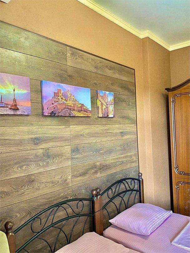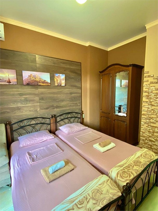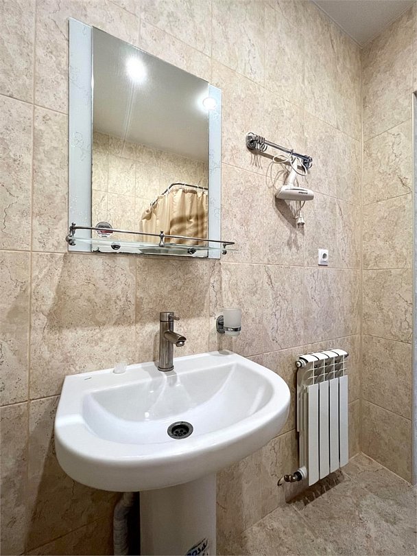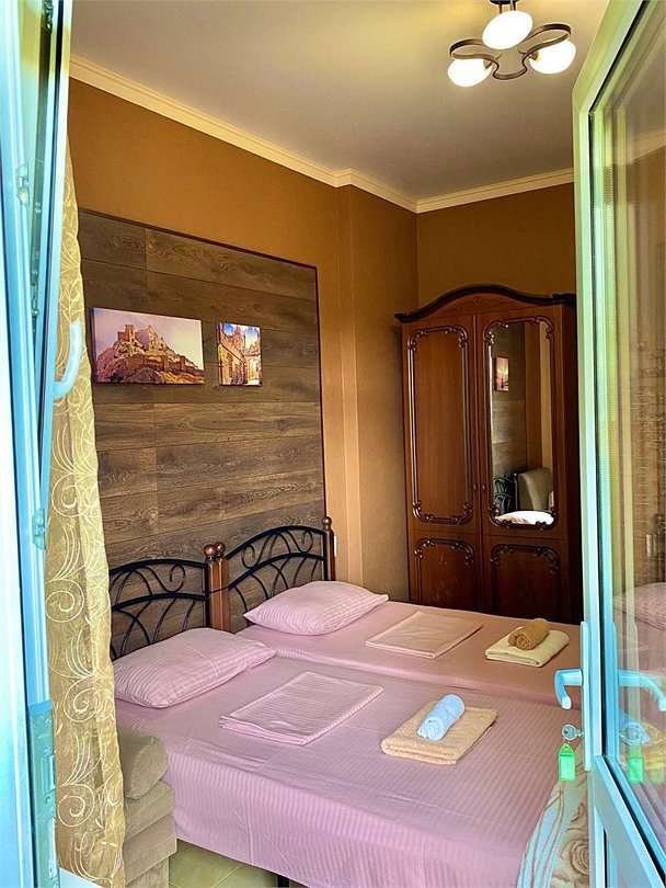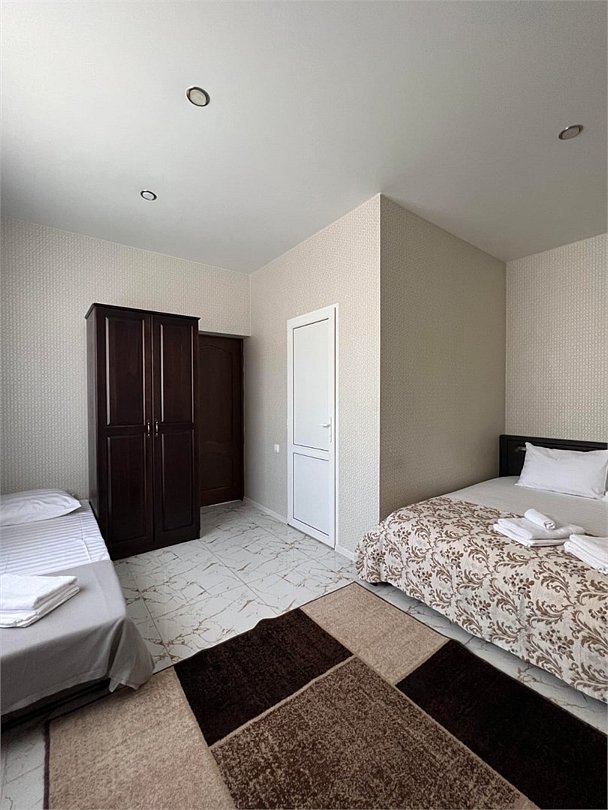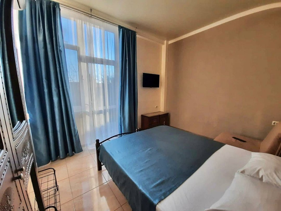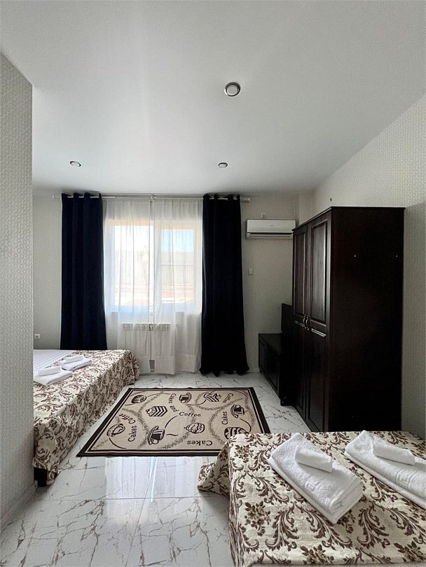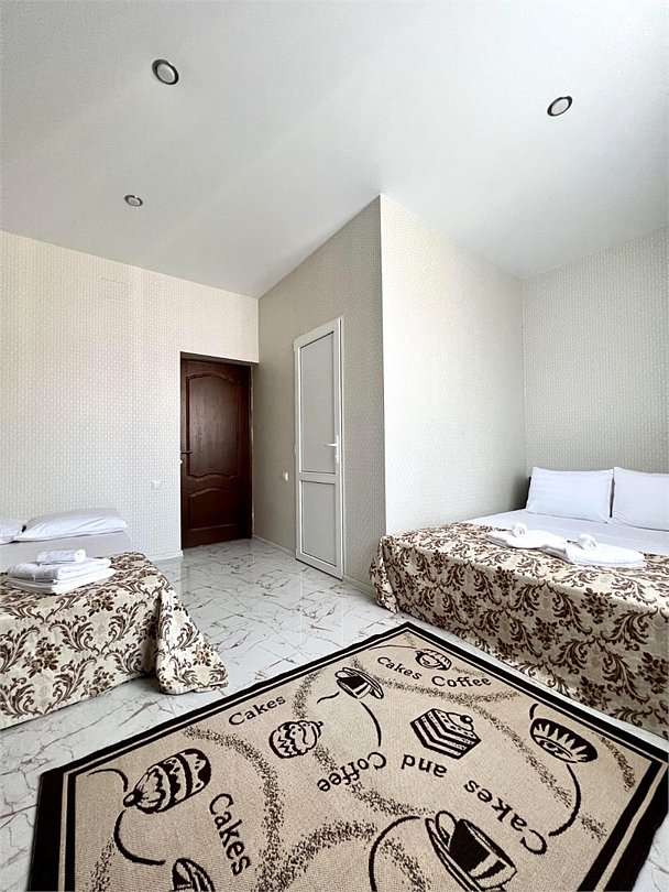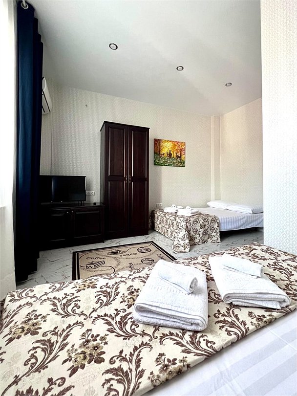 3хместный стандартный номер с удобствами. Расположен в 1 корпусе на Веселой. Площадь номера 24-25 кв.м. Новый ремонт. Качественная мебель. Кровать Queen Size (160*200) с мягким ортопедическим матрасом, раскладной диван, постельное белье, полотенца. Возможна установка дополнительного места (диван раскладной 2хспальный или еврораскладушка). ЖК телевизор, кондиционер. Индивидуальное отопление обеспечивает круглогодичное проживание. Зимой холодно не будет. В ванной комнате душ, раковина, унитаз, зеркало, фен, мыло, гель. Пол-плитка.Услуги и удобства
