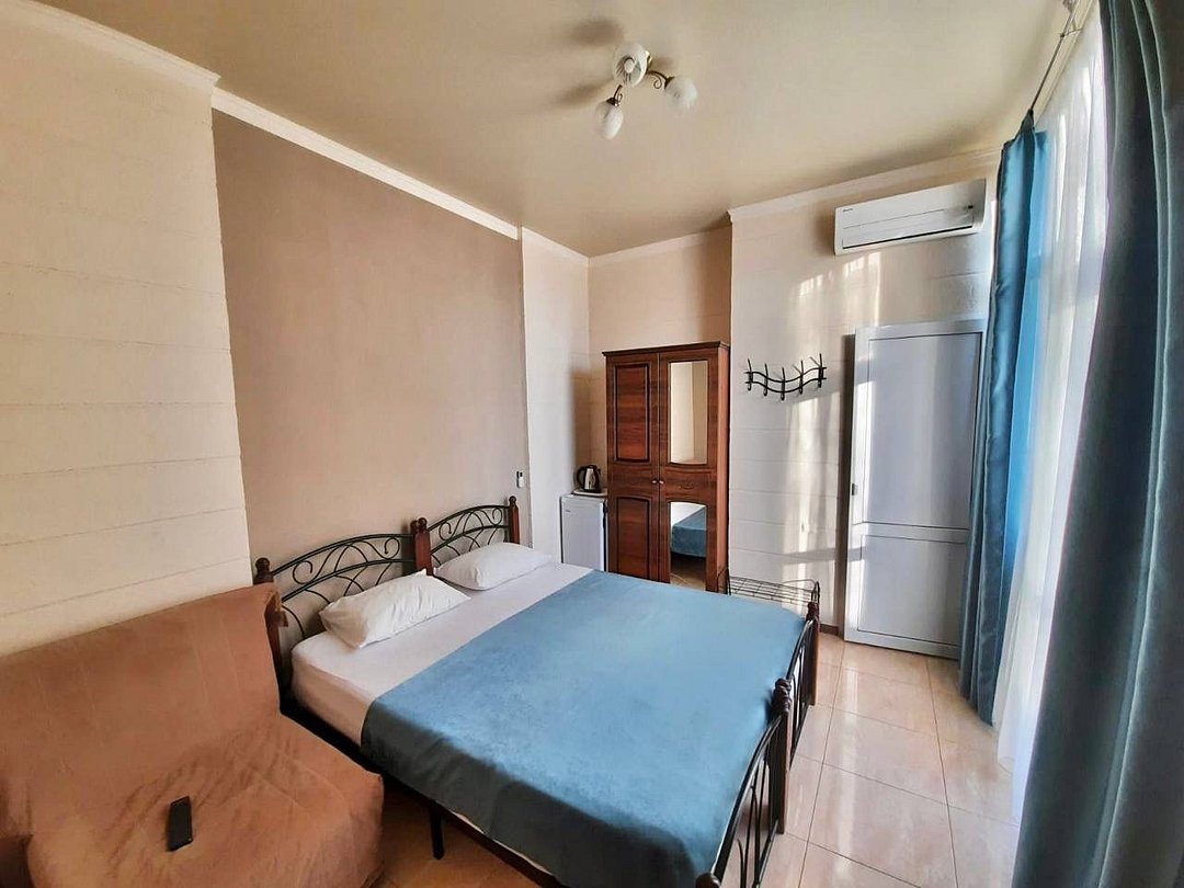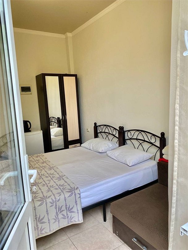 2хместный стандартный номер с удобствами. Расположен в корпусе У Моря (ул.Просвещения, д 115), Площадь номера 15 кв.м. 2 односпальные кровати, которые могут быть объединены в 2х спальную кровать, постельное белье, полотенца. Дополнительное место - раскладное кресло. ЖК телевизор, холодильник, кондиционер. Все номера с балконами, с частичным видом на море и сад. Индивидуальное отопление обеспечивает круглогодичное проживание, зимой холодно не будет. В ванной комнате душ, раковина, унитаз, зеркало, фен, мыло. Пол-плитка. Номера расположены на 2 этаже с общей террасой с зоной отдыха. Есть кухня для самоприготовления. Организованы завтраки.Услуги и удобства