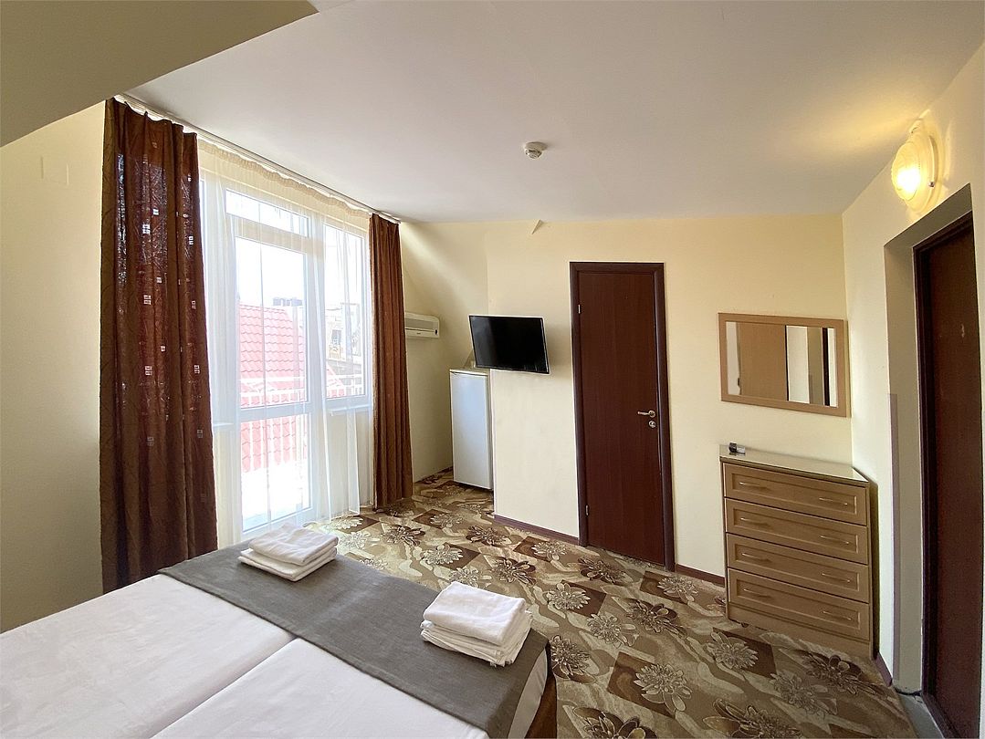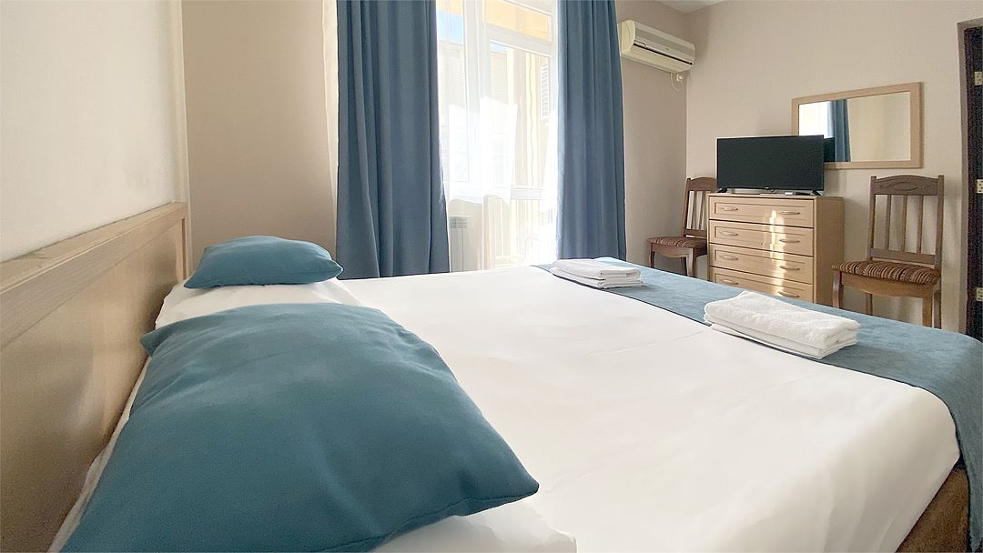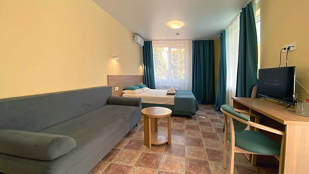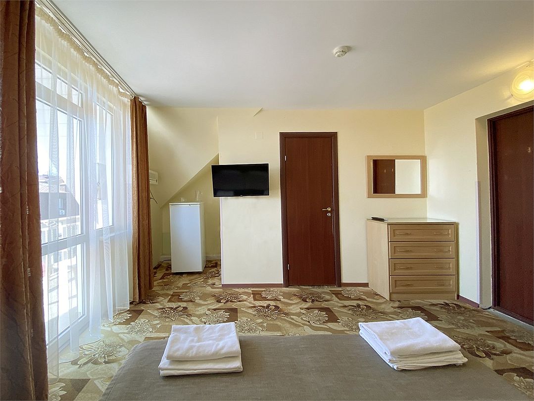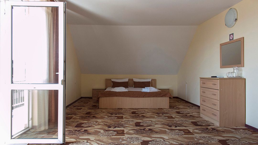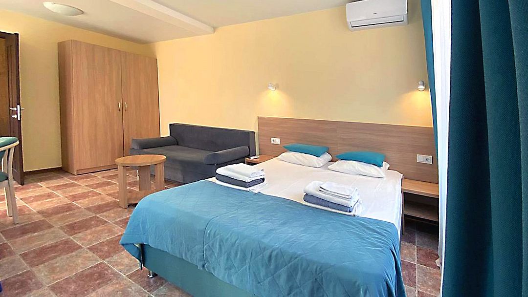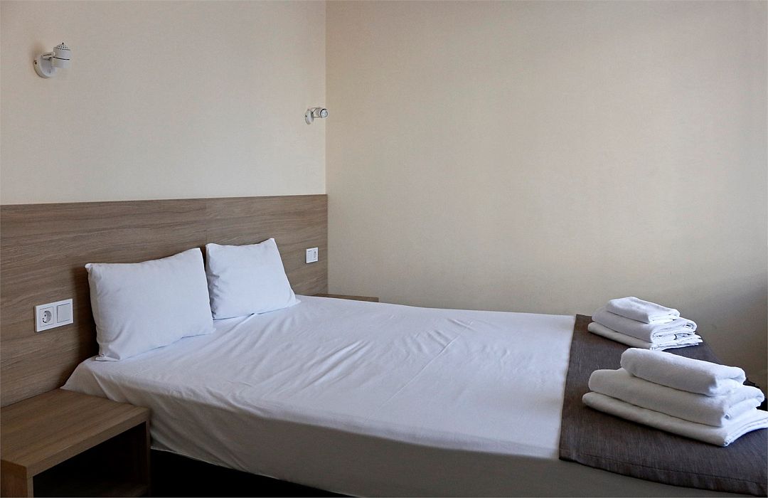 Просторный однокомнатный номер с одной двуспальной кроватью, раскладным и креслом. Без балкона.