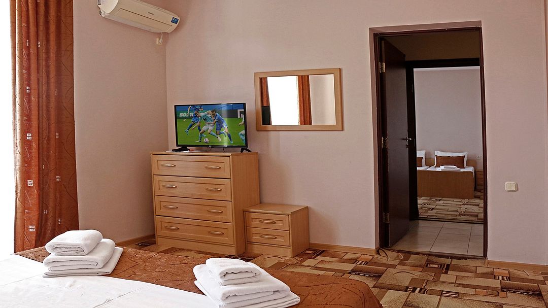 Просторный двухкомнатный номер с одной двуспальной кроватью и двумя односпальными.