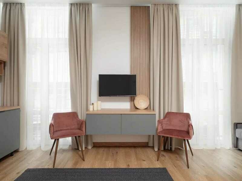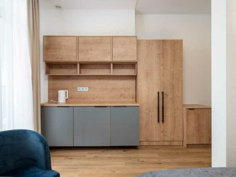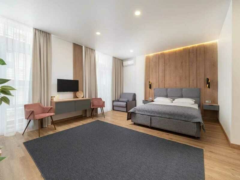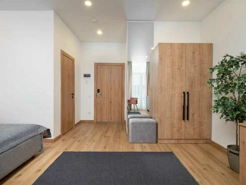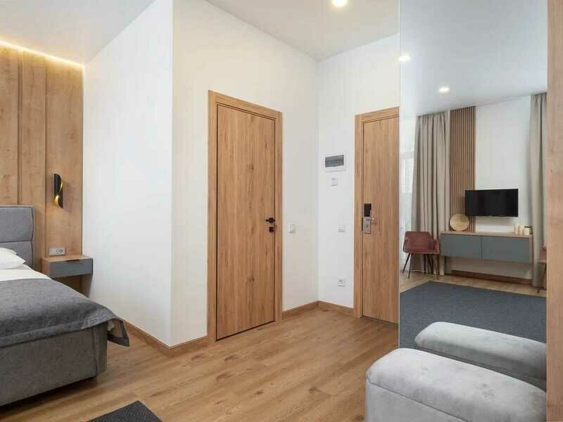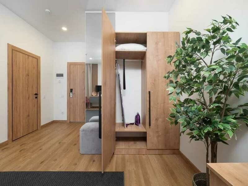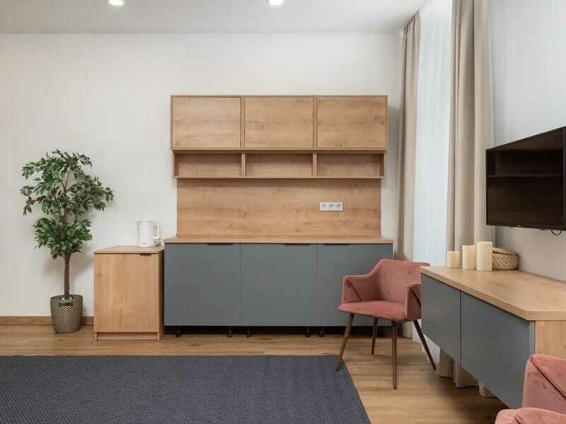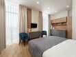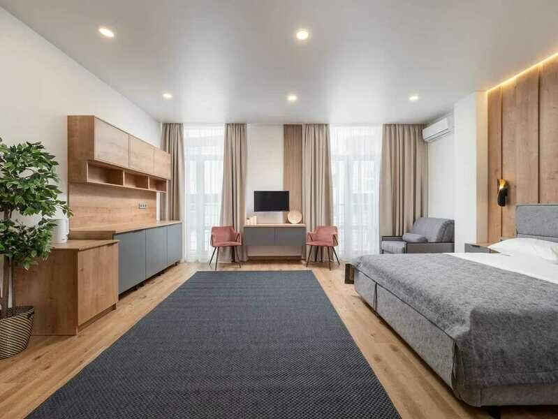 Двуспальная кровать, раскладной диван, с/у с душем, мини-холодильник, ТВ ЖК, сейф, утюг, сплит-система, электрочайник, фен.