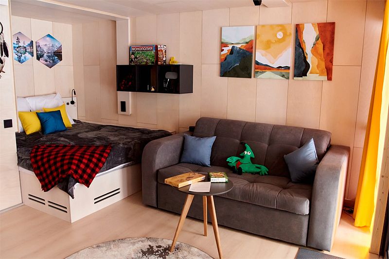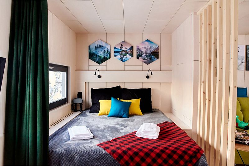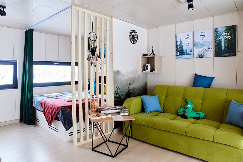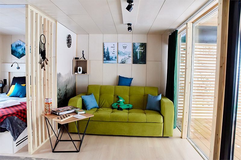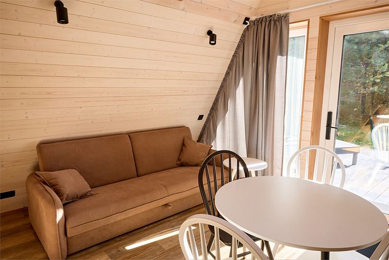Планировка домика — студия, в едином пространстве с панорамными окнами расположены спальная зона с двуспальной кроватью, зона гостиной с раскладным диваном и кухня.