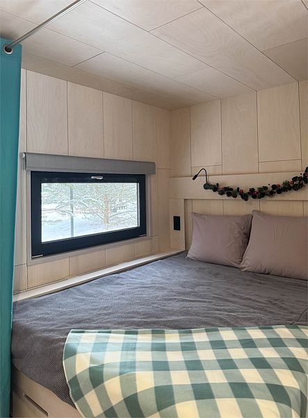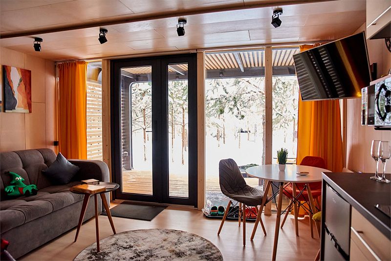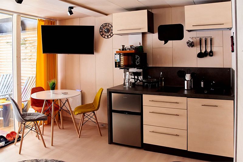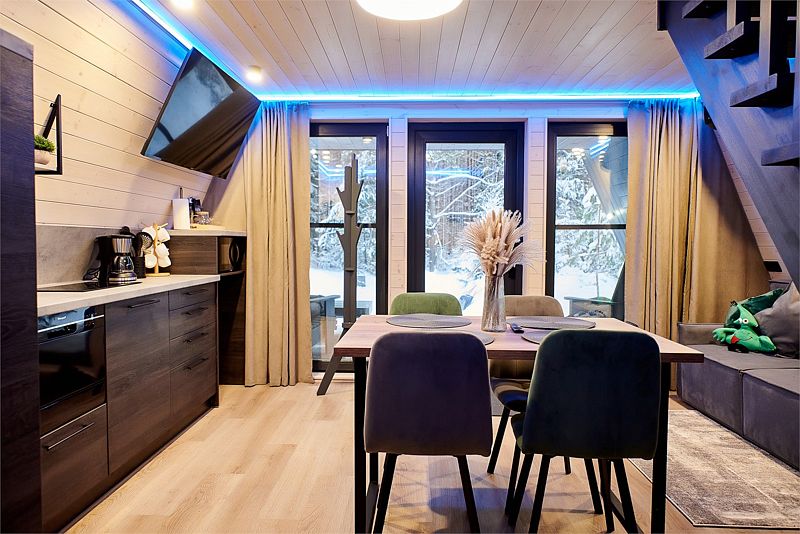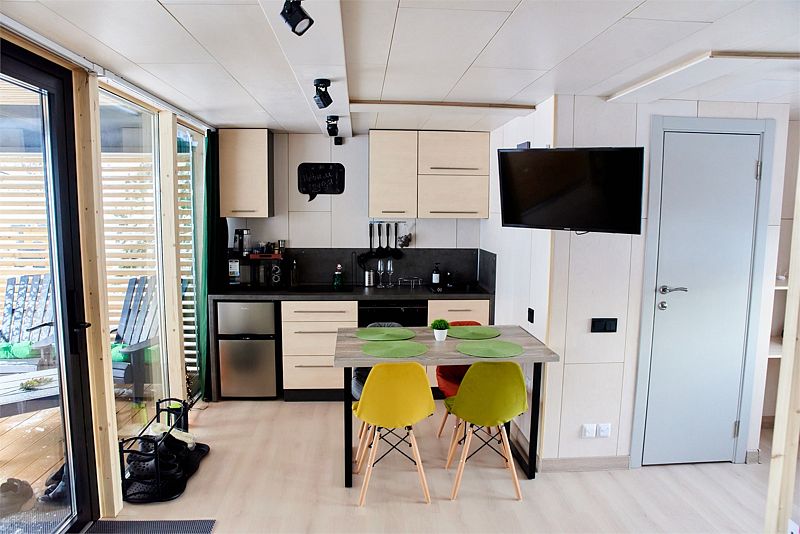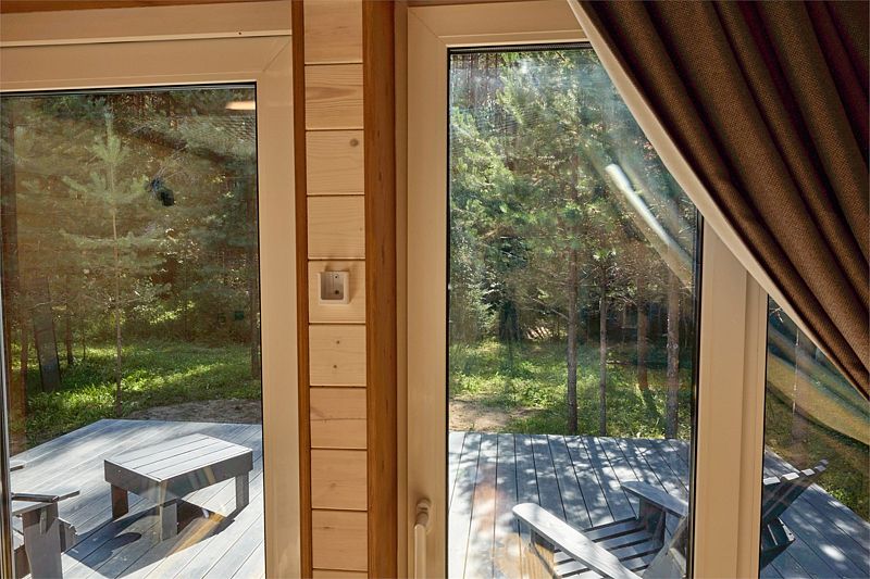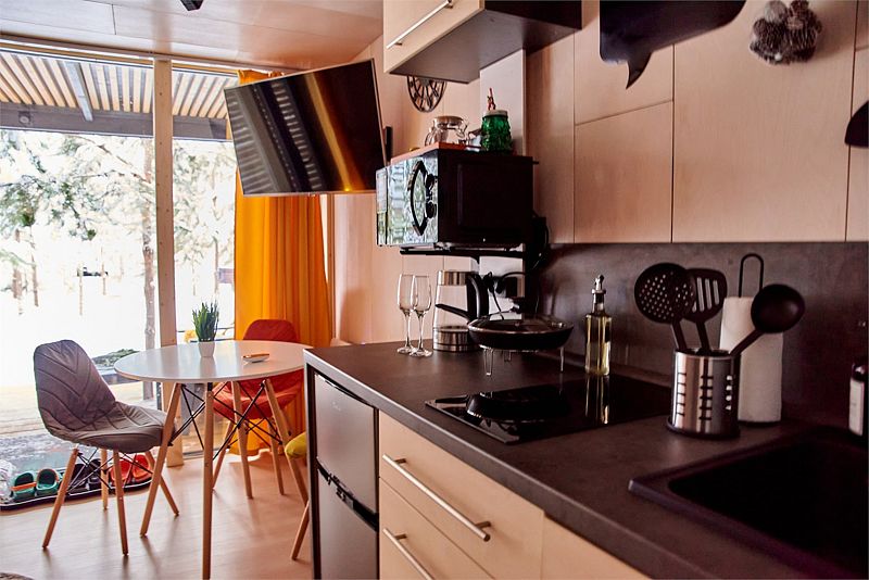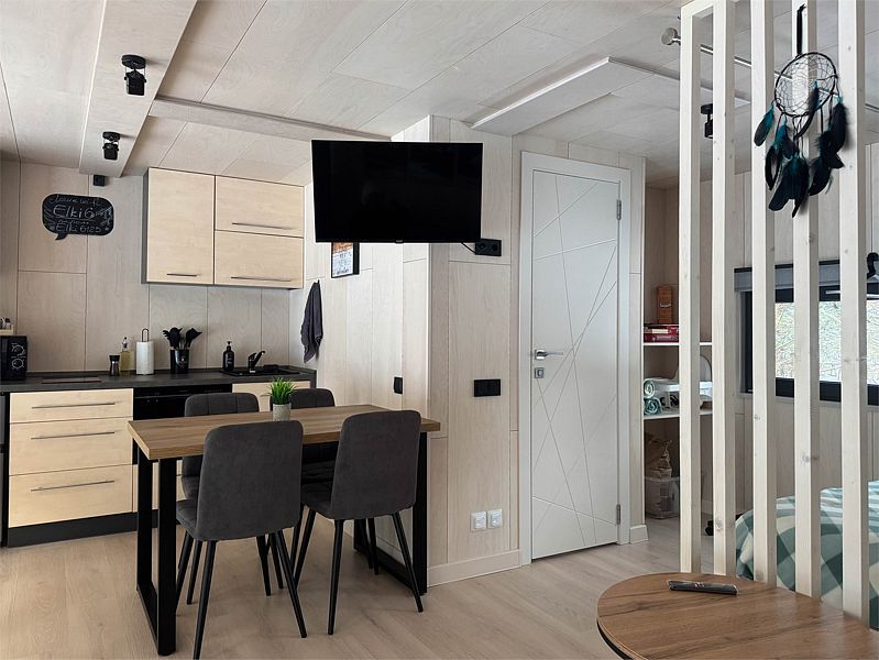 Планировка домика — студия, в едином пространстве с панорамными окнами расположены спальная зона с двуспальной кроватью, зона гостиной с раскладным диваном и кухня. В доме есть smart-TV, wi-fi, теплые полы и обогреватель, санузел с душевой.