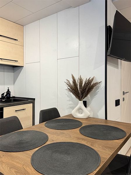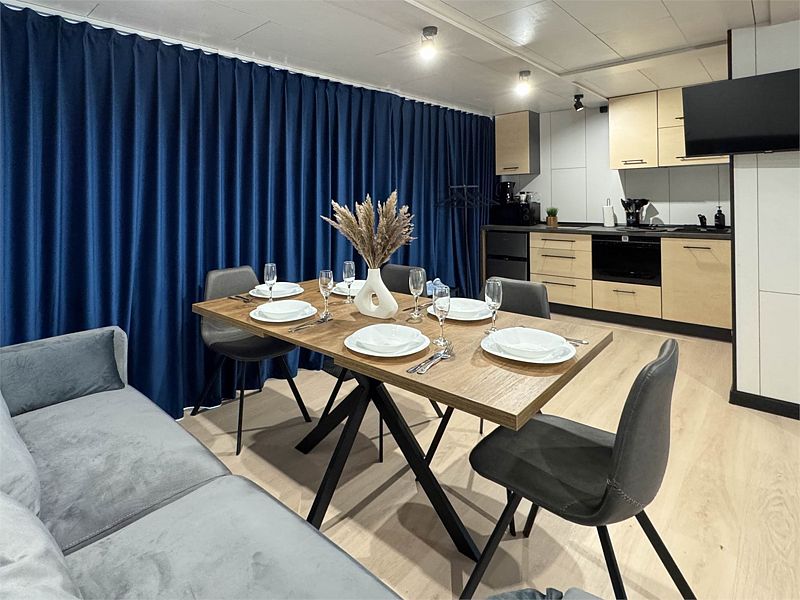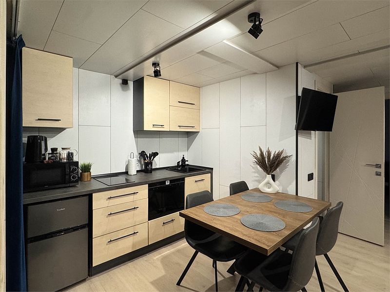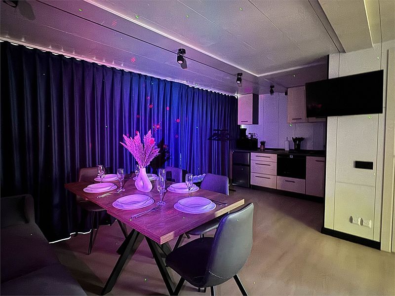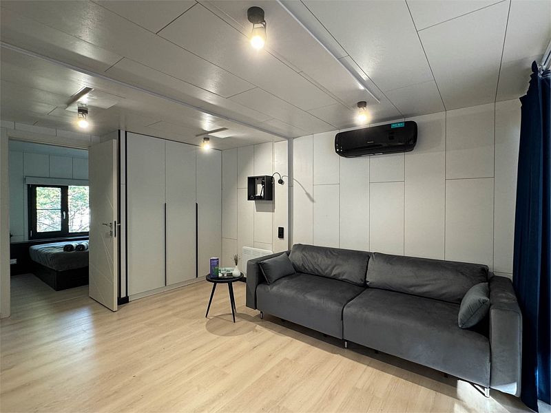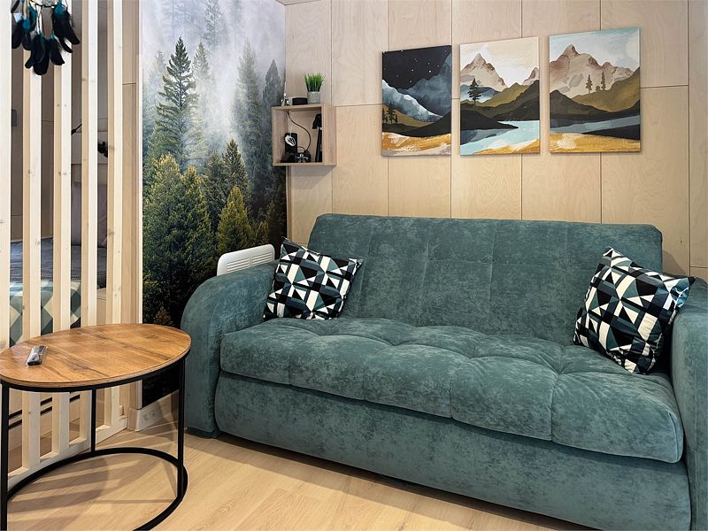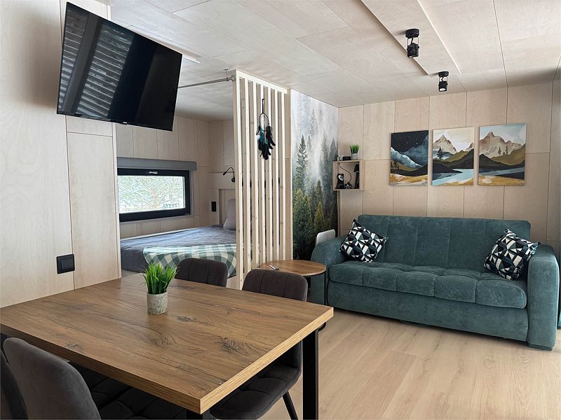 Планировка домика — студия, в едином пространстве с панорамными окнами расположены спальная зона с двуспальной кроватью, зона гостиной с раскладным диваном и кухня. В доме есть smart-TV, wi-fi, теплые полы и обогреватель, санузел с душевой.