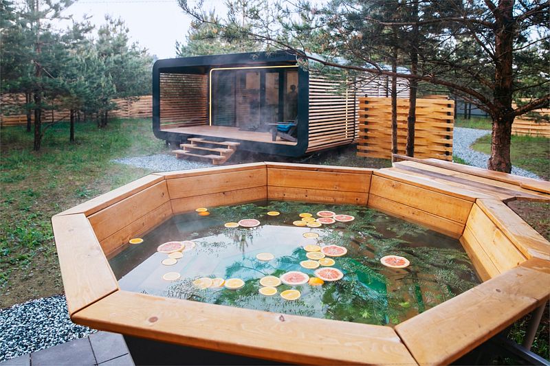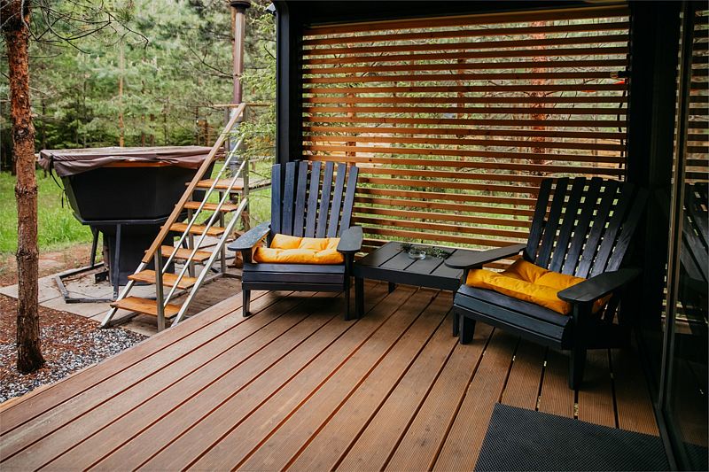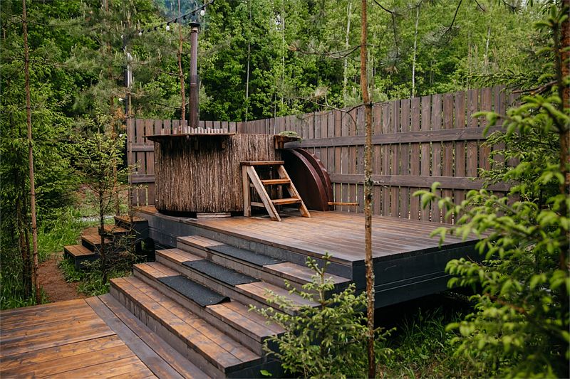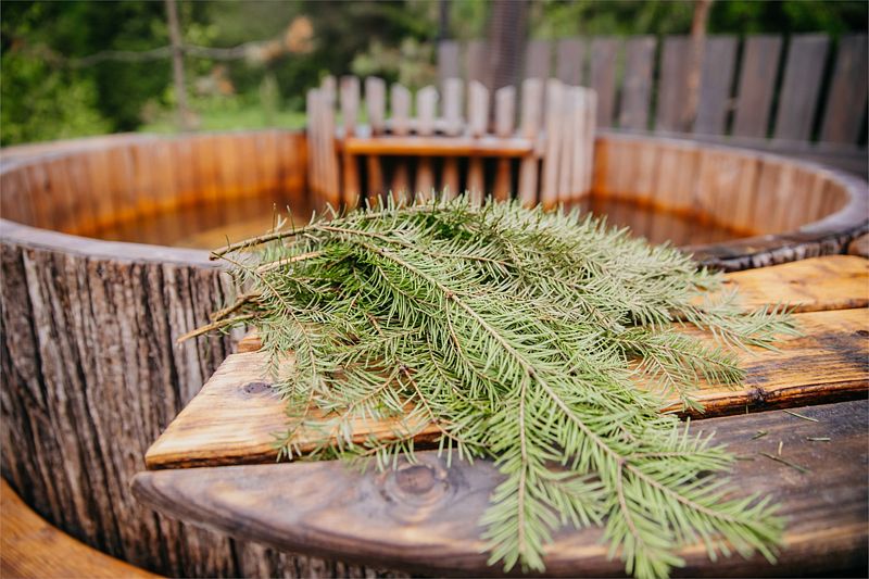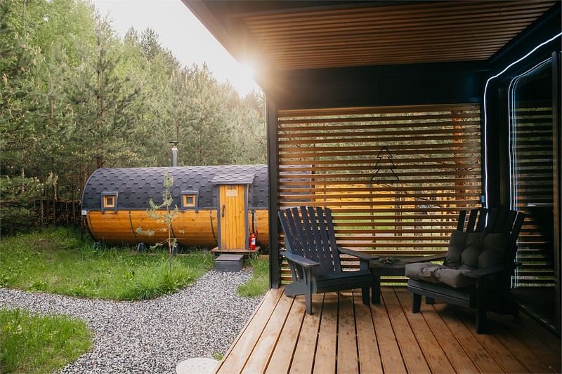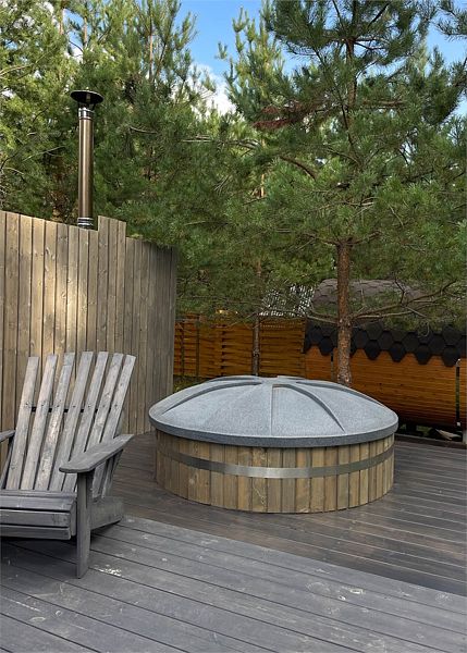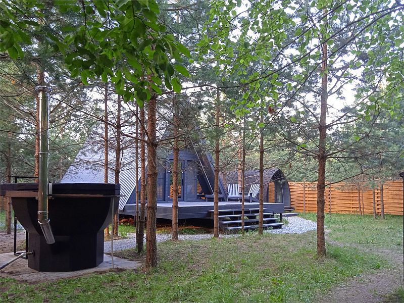 На открытой освещенной террасе домика приятно сесть с чашечкой чая и наслаждаться лесом. На территории коттеджа: мангальная зона, беседка с крышей, электрическая баня «Викинг» и банный чан. Электрическую баню вы сможете легко включить самостоятельно в любое удобное время и пользоваться ей до 4 часов. При аренде чана сотрудник подготовит услугу к выбранному вами времени. Самое раннее время готовности чана 17:00-18:00, самое позднее 21:00-22:00. Комфортная температура воды будет сохраняться около 2 часов.