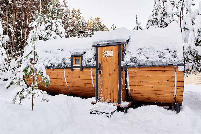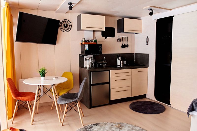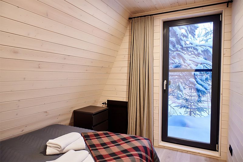 Планировка домика — студия, в едином пространстве с панорамными окнами расположены спальная зона с двуспальной кроватью, зона гостиной с диваном и кухня. В доме есть smart-TV, wi-fi, теплые полы и обогреватель, санузел с душевой.