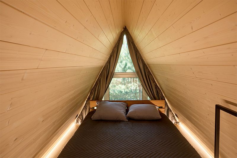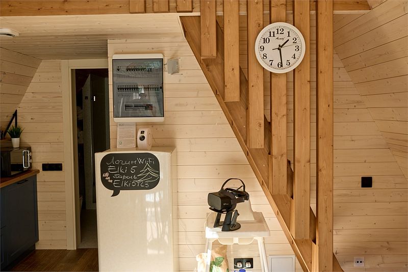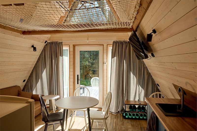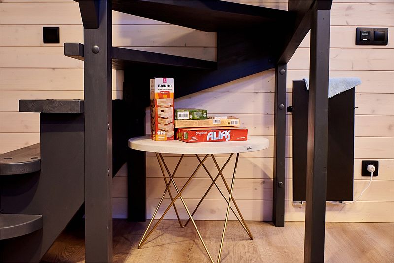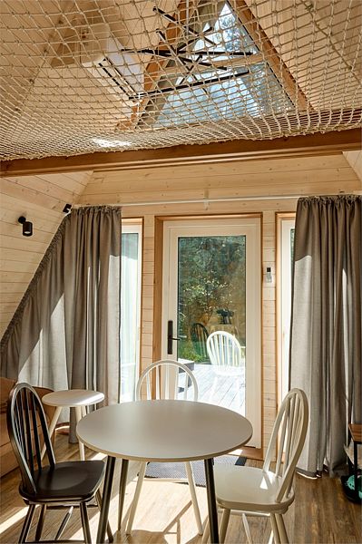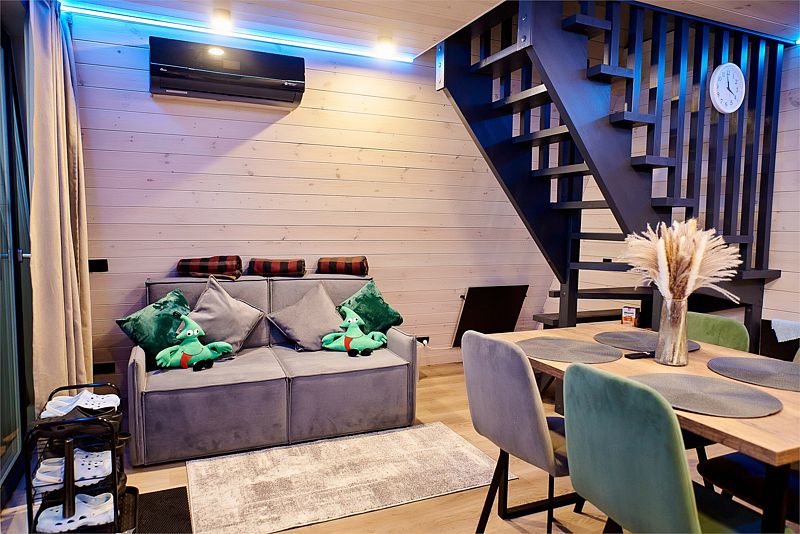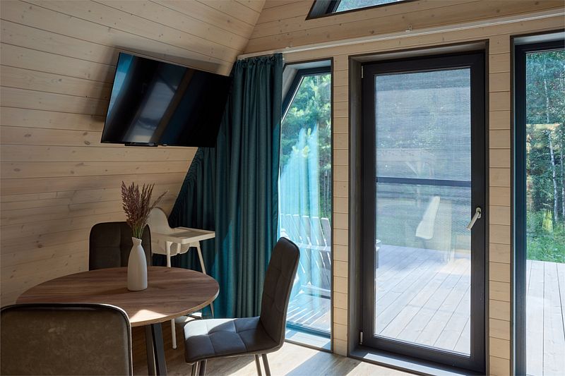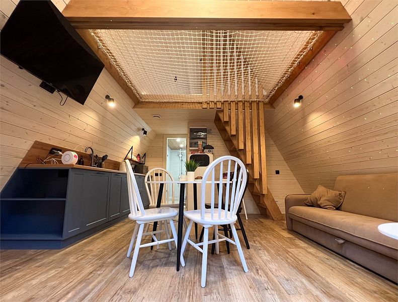 На первом этаже треугольного домика гостиная с раскладным диваном и небольшая кухонная зона, здесь же выход на террасу дома и участок. Лестница наверх ведет к двуспальной кровати на втором этаже. «Второй свет» делает гостиную дома необычайно уютным пространством, в котором хочется проводить время с близкими. В доме есть smart-TV, wi-fi, теплые полы и кондиционер, санузел с душевой.
