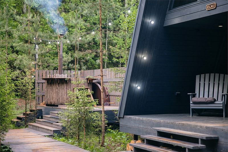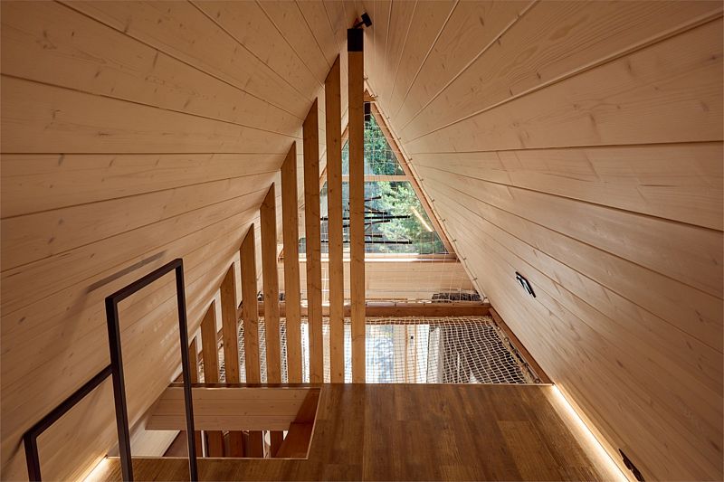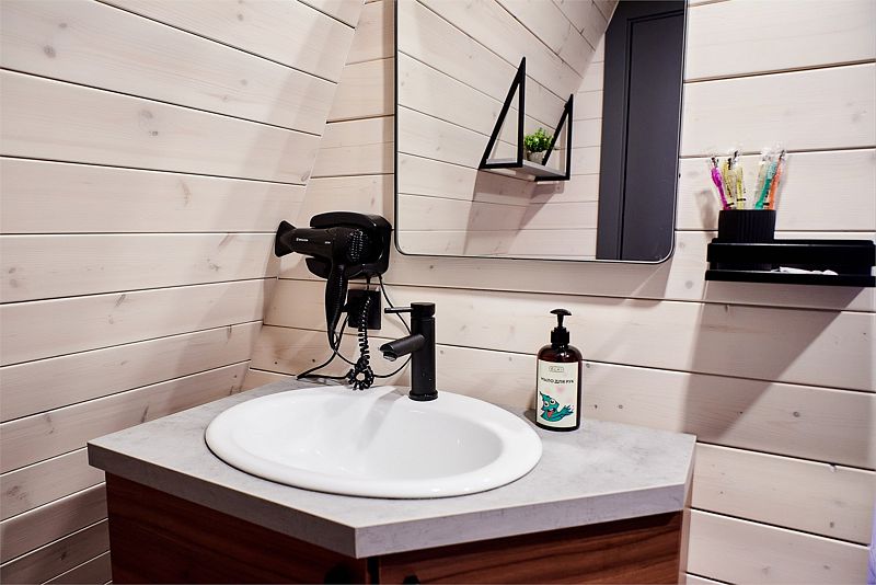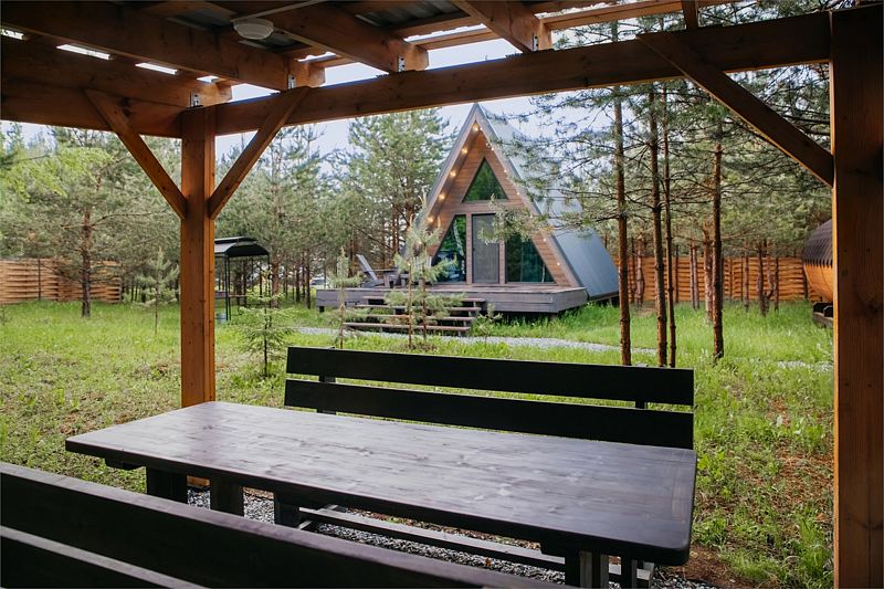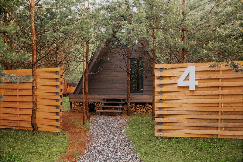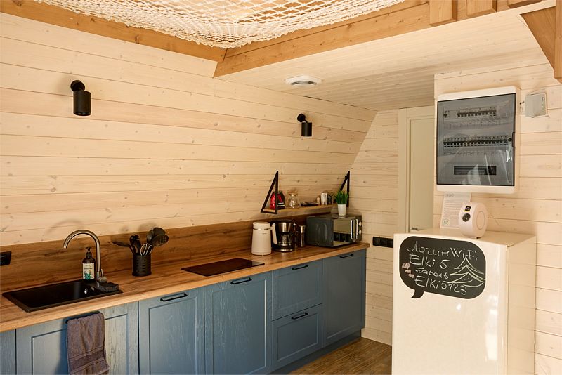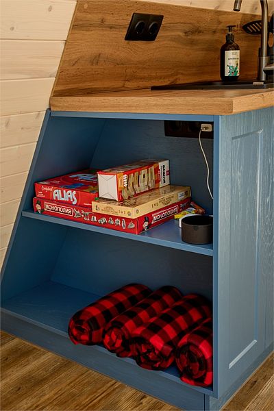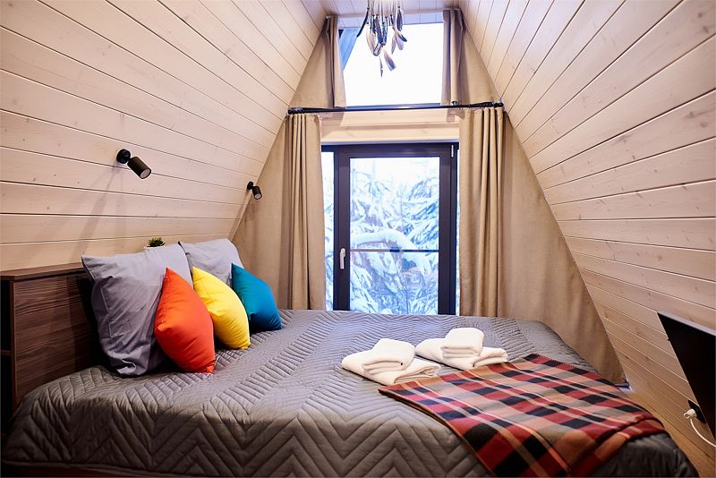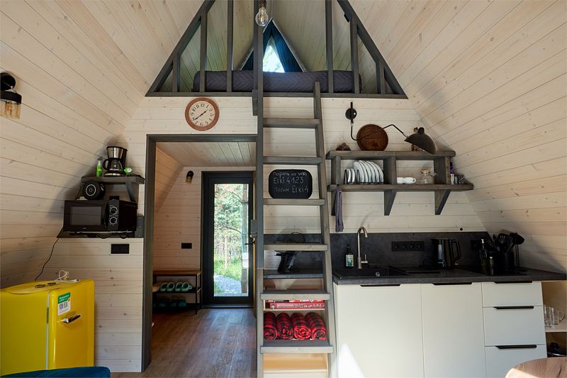 На первом этаже треугольного домика гостиная с раскладным диваном и небольшая кухонная зона, здесь же выход на террасу дома и участок. Лестница наверх ведет к двуспальной кровати на втором этаже. «Второй свет» делает гостиную дома необычайно уютным пространством, в котором хочется проводить время с близкими. В доме есть smart-TV, wi-fi, теплые полы и кондиционер, санузел с душевой.