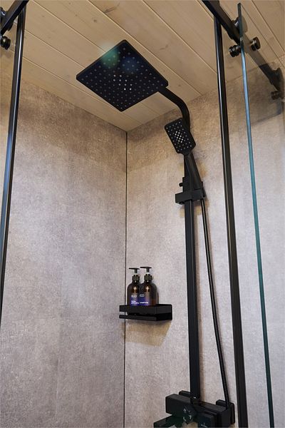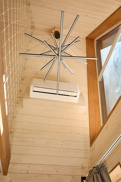 На первом этаже треугольного дома гостиная с раскладным диваном, полноценная кухонная зона, раздельные душ и туалет и изолированная спальня с двуспальной кроватью. На втором этаже места хранения и две отдельные спальни с двуспальными кроватями. В доме есть smart-TV, wi-fi, теплые полы, обогреватель и кондиционер.