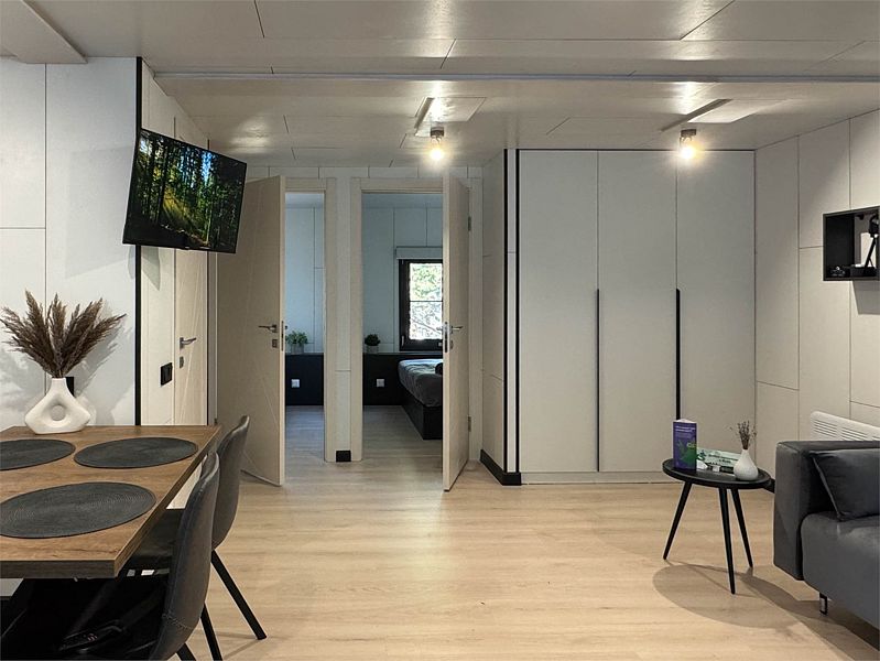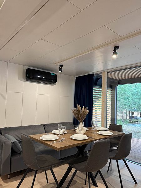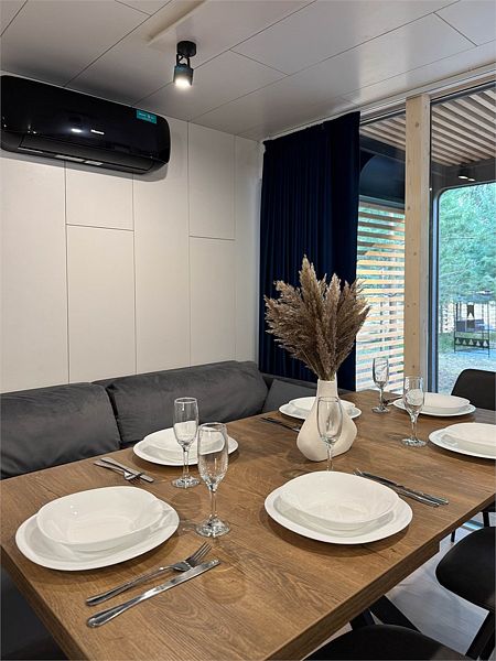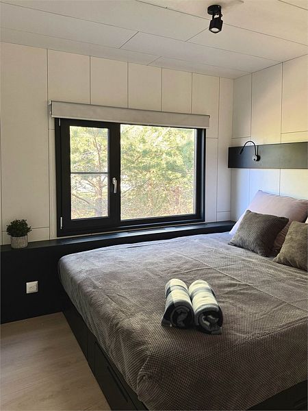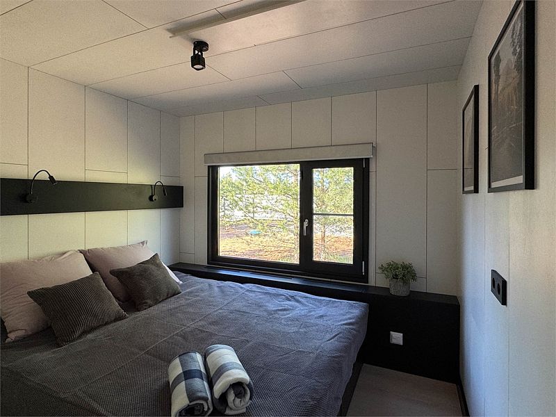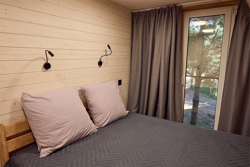 В доме 2 отдельные спальни с двуспальными кроватями и кухня-гостиная с панорамным окном и мягким диваном, вместительная система хранения, smart-TV, wi-fi, теплые полы и кондиционер, санузел с душевой.