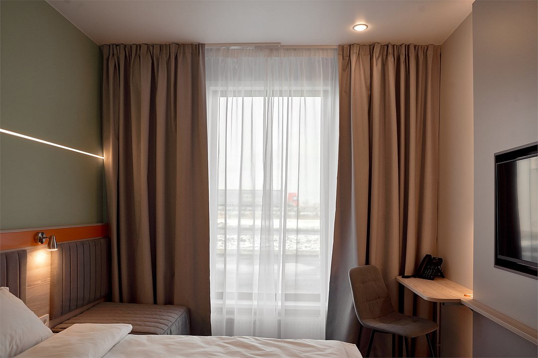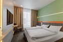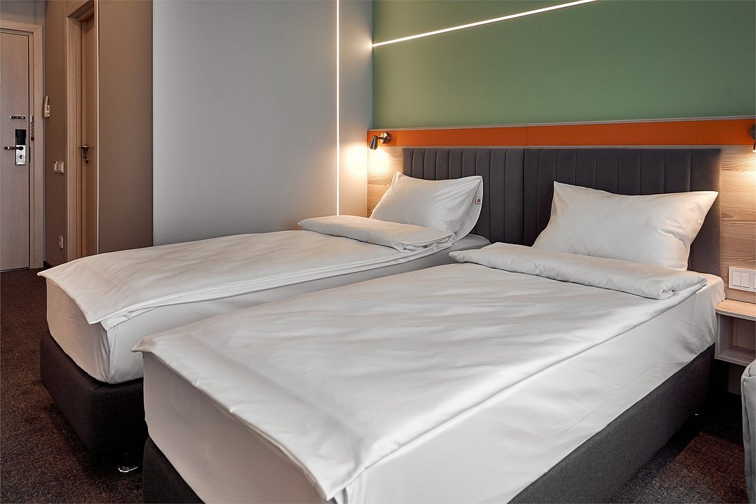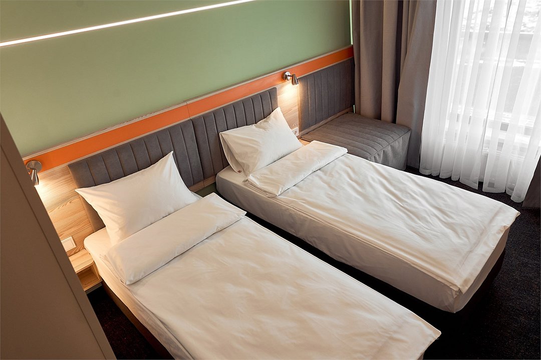 Стандартный номер площадью 18 кв.м. с двумя односпальными кроватями с анатомическими матрасами и дополнительным спальным местом рассчитан на 2 взрослых и 1 ребенка. Для комфортного отдыха в номерах используются светонепроницаемые шторы и улучшенная звукоизоляция. Доступ к высокоскоростному интернету и рабочий уголок позволяют оперативно и комфортно решать рабочие вопросы. Для детей до 5 лет включительно проживание в одном номере со взрослыми предоставляется бесплатно на отдельном спальном месте. По запросу может быть предоставлена детская кроватка (для детей от 0 до 3 лет).Услуги и удобства