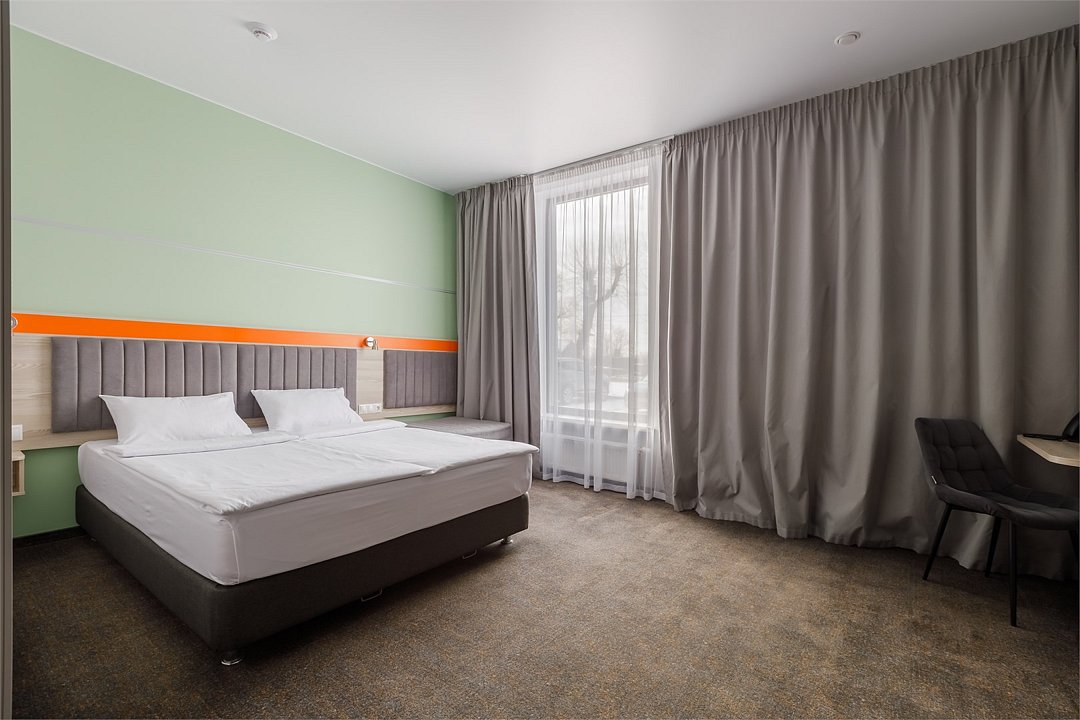Стандартный номер площадью 18 кв.м. с одной двуспальной кроватью с анатомическим матрасом рассчитан на 2 взрослых и 1 ребенка. Для комфортного отдыха в номерах используются светонепроницаемые шторы и улучшенная звукоизоляция. Доступ к высокоскоростному интернету и рабочий уголок позволяют оперативно и комфортно решать рабочие вопросы. Для детей до 5 лет включительно проживание в одном номере со взрослыми предоставляется бесплатно на отдельном спальном месте. По запросу может быть предоставлена детская кроватка (для детей от 0 до 3 лет).Услуги и удобства