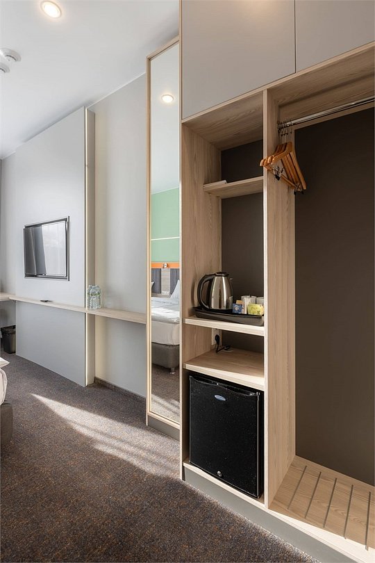 Wi-Fi, телефон, кондиционер, фен, будильник, электронные замки, душевая кабина, санузел, банные полотенца, тапочки, две односпальные кровати, шкаф для одежды, ковровое покрытие, кулер на этаже, стул, туалетные средства, туалет, телевизор с плоским экраном, мини-холодильник, пуфик, рабочий стол, чайная станция, услуги прачечной (платно), вешалки-плечики, бутилированная вода, затемняющая штора, зеркало в полный рост, можно с питомцами, игрушки, миска, пакетик для выгулаВ номере