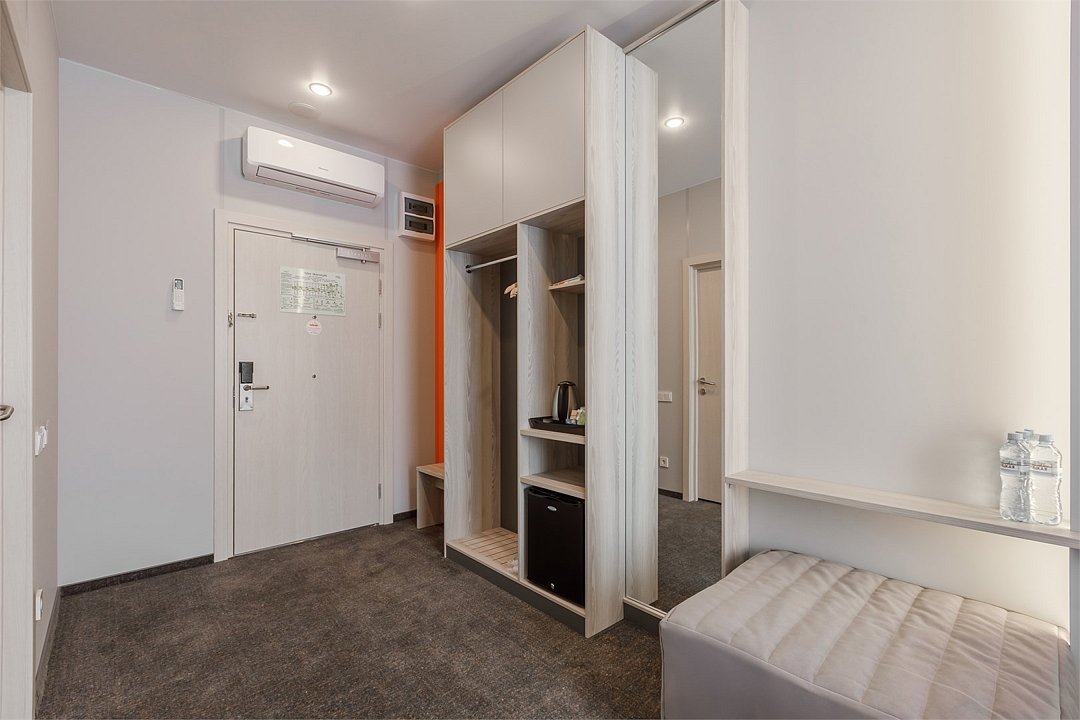 Wi-Fi, телефон, кондиционер, фен, будильник, электронные замки, душевая кабина, санузел, банные полотенца, тапочки, кровать «Queen size», шкаф для одежды, письменные принадлежности, ковровое покрытие, кулер на этаже, стул, туалетные средства, туалет, телевизор с плоским экраном, мини-холодильник, пуфик, рабочий стол, чайная станция, услуги прачечной (платно), вешалки-плечики, бутилированная вода, затемняющая штора, зеркало в полный рост, можно с питомцами, игрушки, миска, пакетик для выгула, пеленкаВ номере