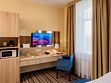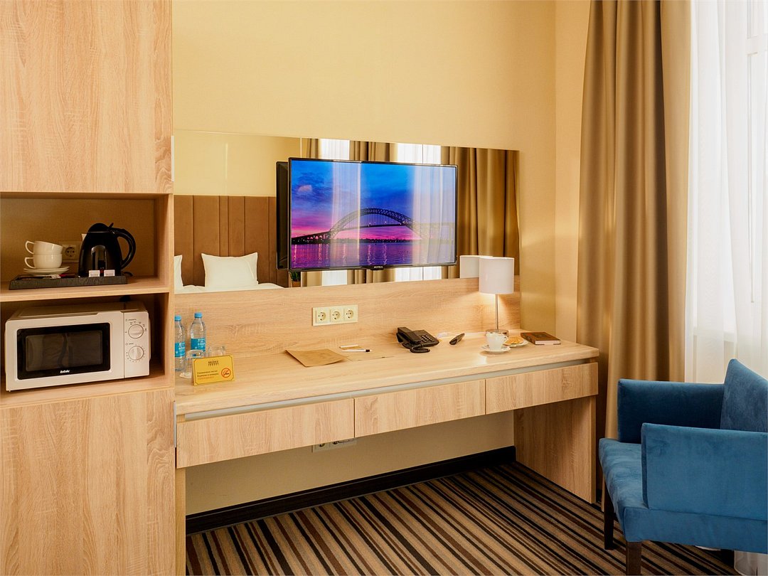 Wi-Fi, кондиционер, светильник, настольные лампы, фен, система безопасности, электронные замки, утюг, обогреватель, душевая кабина, двуспальная кровать, шкаф для одежды, зеркало, пуфики, сейф, чайник, ковровое покрытие, вид на город, кулер на этаже, вид во двор, меню подушек, туалет, цифровое тв, телевизор с плоским экраном, мини-холодильник, гостиничная парфюмерия, рабочий столВ номере