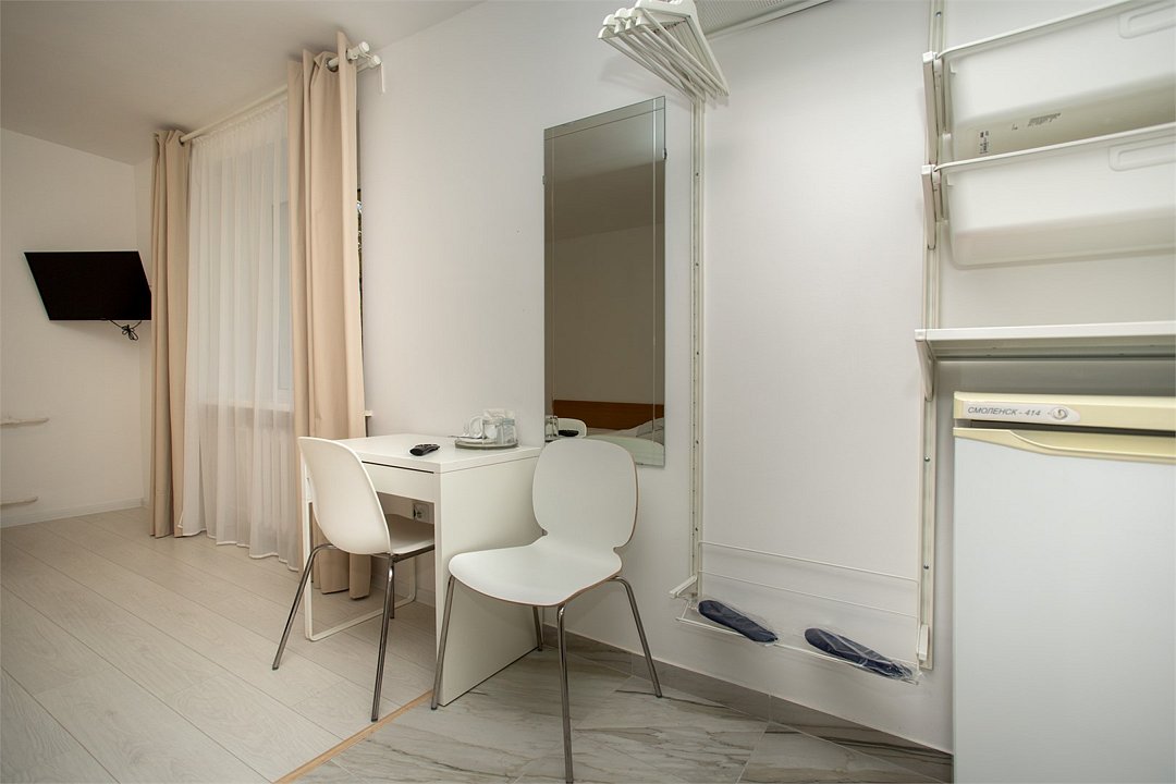 Номер включает две комнаты. В каждой из них предусмотрено все необходимое для удобного временного проживания. Установлено две односпальные кровати с эргономичными матрасами, журнальный стол, кресло и стул. Вся одежда постояльцев разместится в просторном платяном шкафу. Дополнительно предусмотрен холодильник для хранения продуктов и ЖК-телевизор. Интерьер выполнен в современном стиле. Ванная комната имеет функциональный дизайн. В ней установлен унитаз, умывальник и душевая кабина. В стоимость входит пользование Wi-Fi, полотенца, набор средств для личной гигиены и одноразовые тапочки для жильцов.ОДНОМЕСТНЫЙ НОМЕР