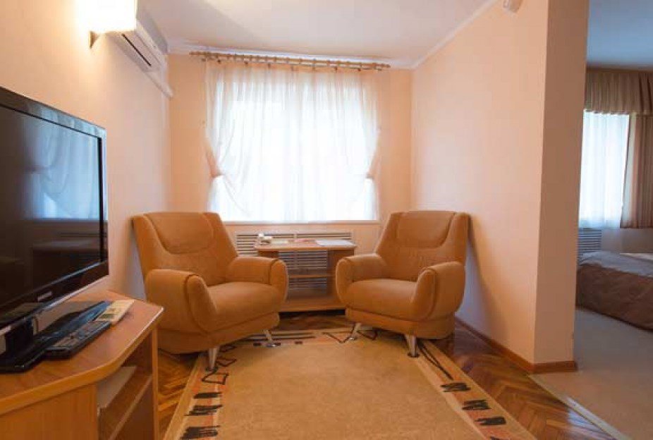 Спальная и гостиная комнаты обставлены: двуспальной кроватью с ортопедическим матрасом и подушками из латекса; журнальными столиками с посудой; холодильником; мягкими креслами; телевизором; платяным шкафом. Имеются кондиционер, прикроватные полочки. Стена над ложем украшена стильной картиной. Отдельно расположен санузел с предметами личной гигиены, феном для волос, чистыми халатами и индивидуальными тапочками.Услуги и удобства