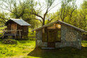 Деревянные домики вместимостью 6 человек. Внутри жилые комнаты, односпальные или двуспальные кровати, постельное белье, вешалки. Внутренняя отделка из натурального дерева. Туалет и душ летние.