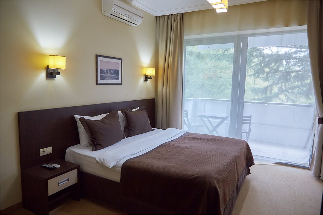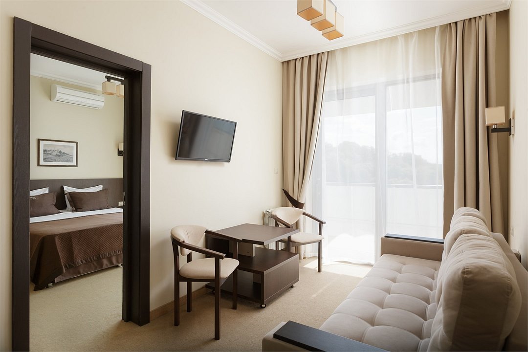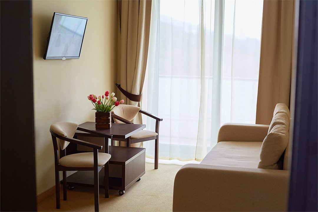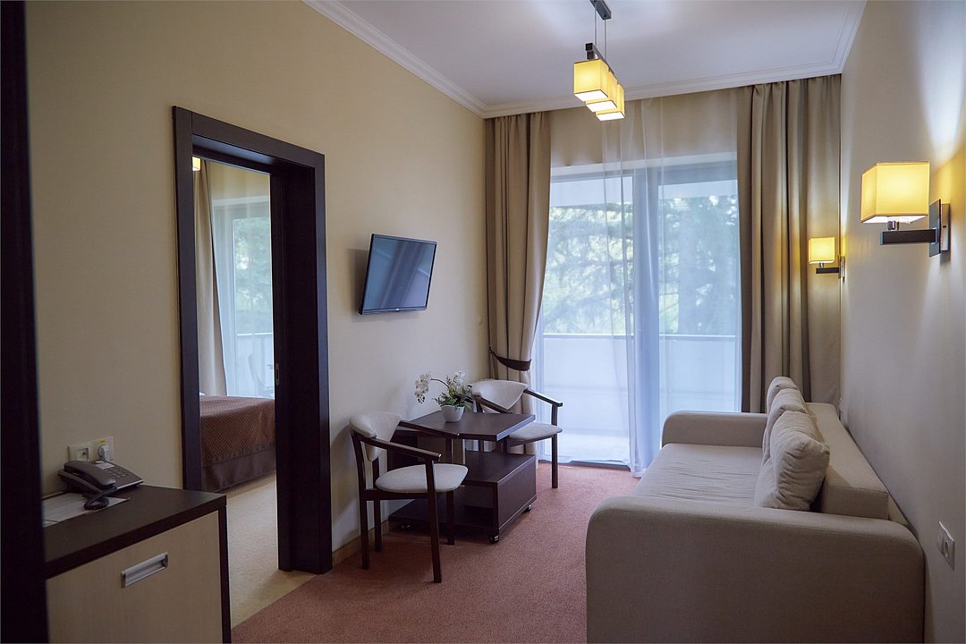 Номер площадью от 43,2 м2 до 43,6 м2*, с балконом, в спальне двуспальная кровать с прекрасным матрасом, раскладное кресло кровать, в гостиной мягкий диван. Туалетные принадлежности предоставляются единоразово в день заезда и пополняются по просьбе гостя . Сейф в номере. Кофе машины Nespresso 1 капсула на гостя комплимент от санатория Предоставляются халаты и тапочки. Для самых маленьких гостей предоставляются бесплатно: детская кровать (манеж),ванночка, горшок, подставка для раковины под запрос при наличии. *Площадь номера указана с балконом.Услуги и удобства