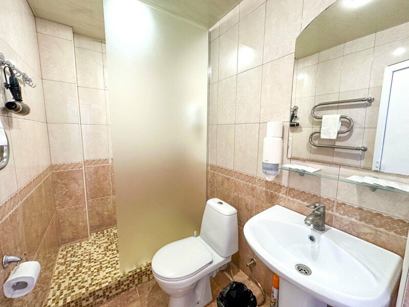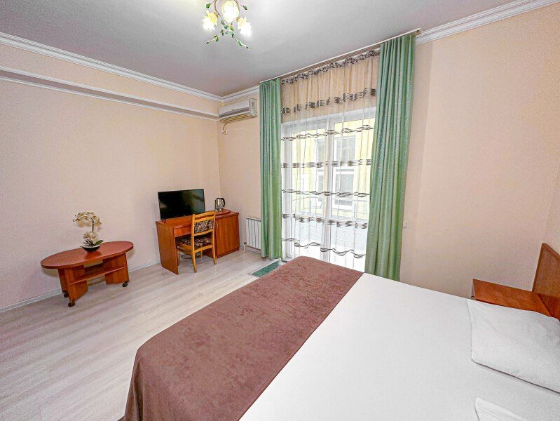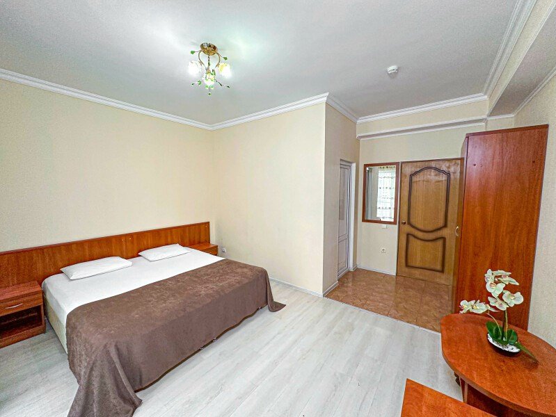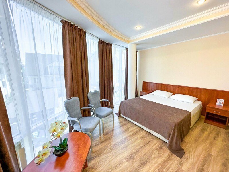 Номер стандарт - это номер с двумя односпальными или одной двуспальной кроватью. С комфортом можно разместиться одному или двум гостям, или семье из двух человек с ребенком возрастом до 4 лет включительно (ребенок без доплаты размещается на спальных местах с родителями). В номере собственный санузел с душевой кабиной. Номер оснащен индивидуальным кондиционером и имеет доступ к сети Wi-Fi. В номере есть все необходимое для полноценного отдыха или для работы. Мини холодильник, телевизор, электрочайник, бокалы, фен, шкаф для одежды, рабочий стол, журнальный столик. В санузле косметические принадлежности: мыло, шампунь, гель для душа, туалетная бумага, комплект полотенец (для ног, лицевые и банные). Расположены номера с первого по четвертый этаж. Напольное покрытие – ламинат.Услуги и удобства