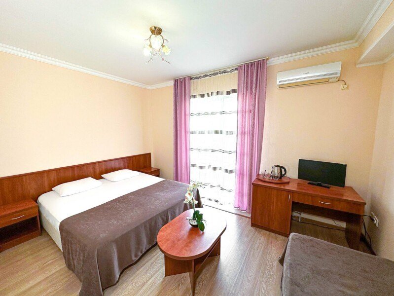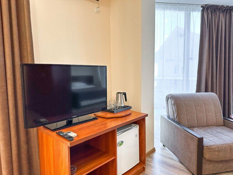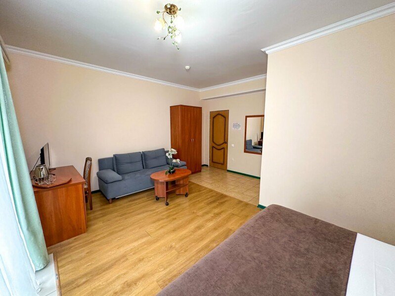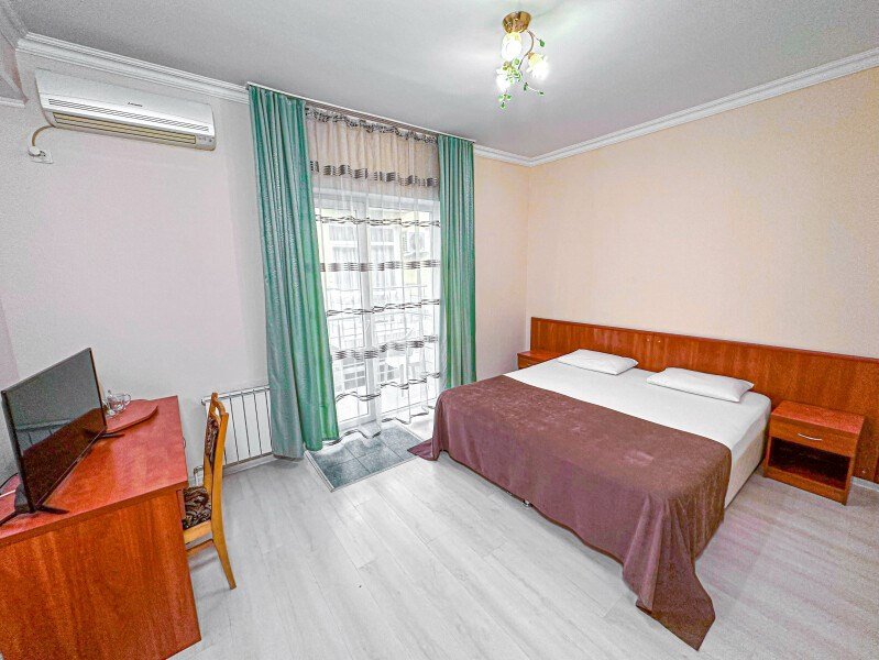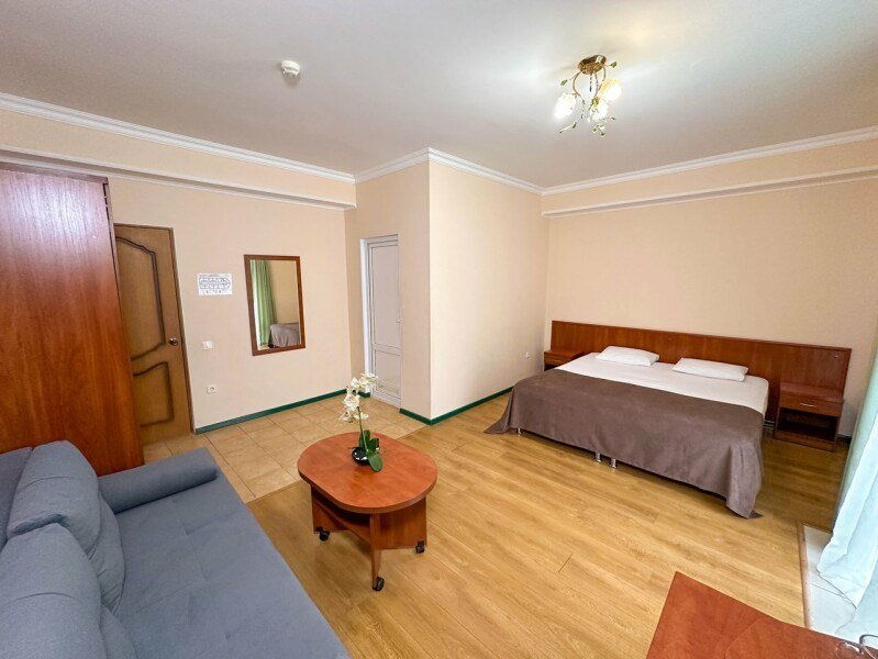 телевизор, Wi-Fi, кондиционер, фен, санузел, банные полотенца, тапочки, гигиенические средства, балкон, двуспальная кровать, шкаф для одежды, журнальный столик, зеркало, чайник, раковина, отопление, душ, вид во двор, стаканы, мини-холодильник, номер для некурящих, двуспальный раскладной диван-кровать, уборка номера, мылоВ гостиничном номере