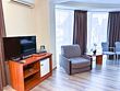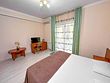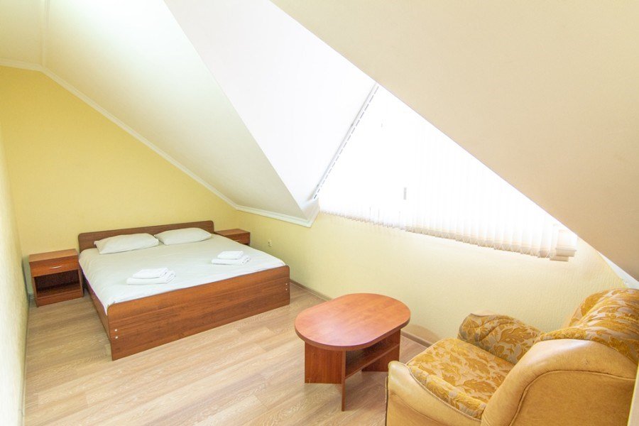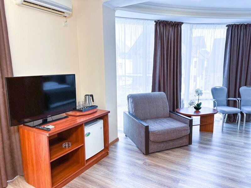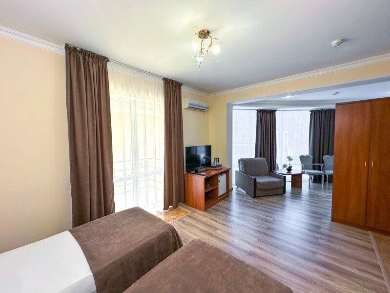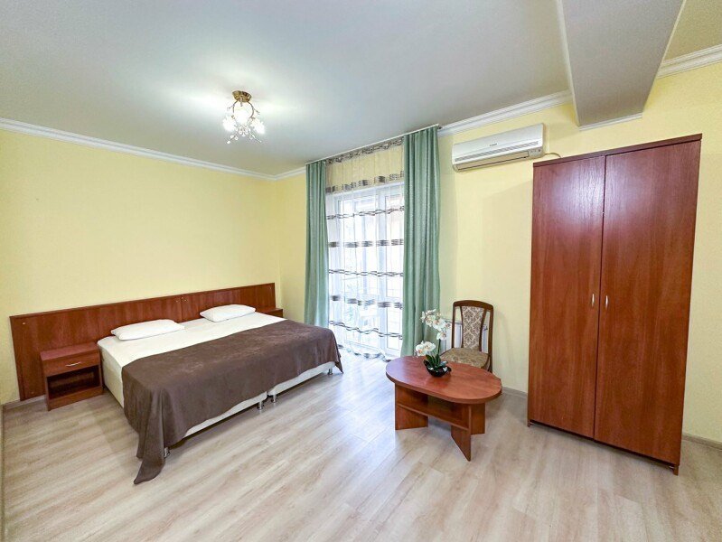 В номере делюкс с балконом может с комфортом разместиться семья из четырех человек. В номере двуспальная кровать (или две односпальные кровати) и двуспальный диван. Без доплаты возможно размещение одного ребенка возрастом до 4 лет включительно при размещении на спальных местах с родителями. В номере собственный санузел с душевой кабиной. Номер оснащен индивидуальным кондиционером и имеет доступ к сети Wi-Fi. В номере есть все необходимое для полноценного отдыха или для работы. Мини холодильник, телевизор, электрочайник, бокалы, фен, шкаф для одежды, рабочий стол, журнальный столик. В санузле косметические принадлежности: мыло, шампунь, гель для душа, туалетная бумага, комплект полотенец (для ног, лицевые и банные). Расположены номера со второго по четвертый этаж. Напольное покрытие – ламинат. В номере есть балкон.Услуги и удобства
