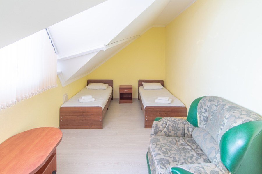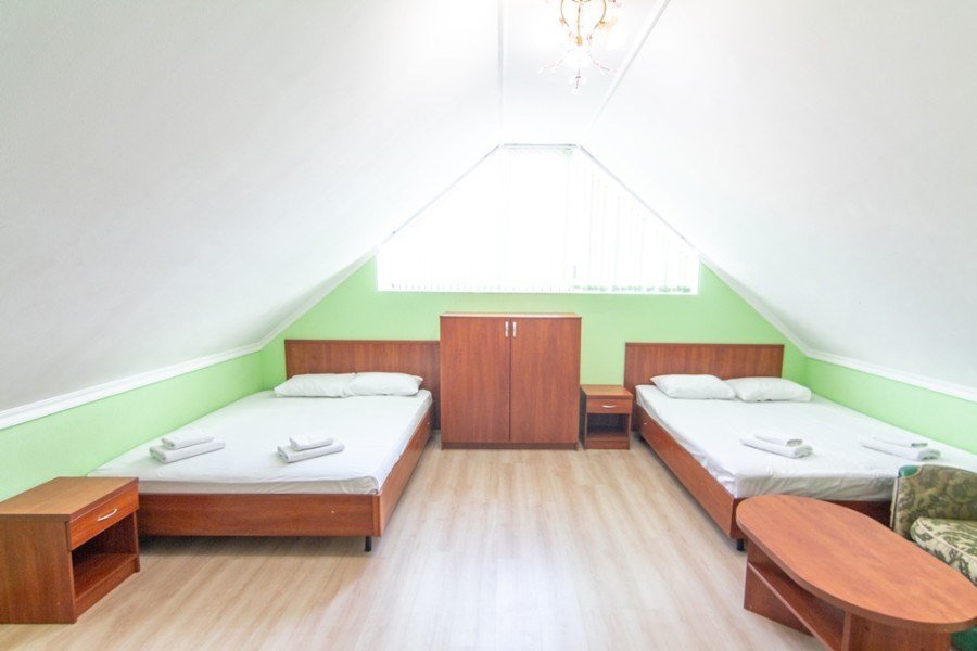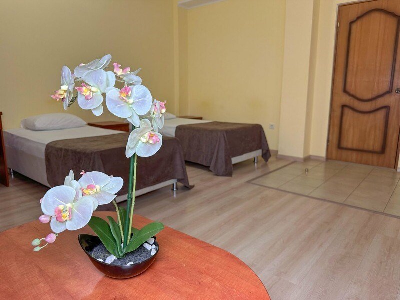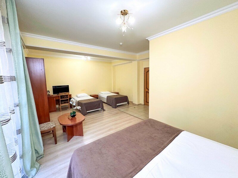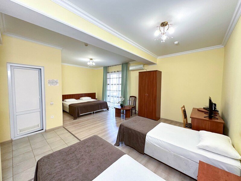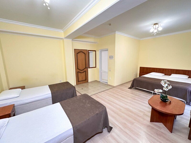 Семейный номер – номер для размещения 4-х гостей. Расположены номера на пятом этаже. Без доплаты возможно размещение одного ребенка возрастом до 4 лет включительно при размещении на спальных местах с родителями. В номере собственный санузел с душевой кабиной. Номер оснащен индивидуальным кондиционером и имеет доступ к сети Wi-Fi. В номере есть все необходимое для полноценного отдыха или для работы. Мини холодильник, телевизор, электрочайник, бокалы, фен, шкаф для одежды, рабочий стол, журнальный столик. В санузле косметические принадлежности: мыло, шампунь, гель для душа, туалетная бумага, комплект полотенец (для ног, лицевые и банные). Номера комплектуются набором полотенец на каждого гостя (банное, лицевое и полотенце для ног). В ванной комнате есть жидкое мыло. Напольное покрытие – ламинат.Услуги и удобства