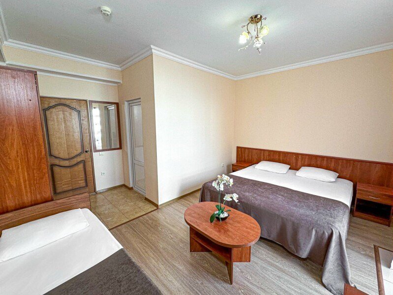 телевизор, Wi-Fi, кондиционер, фен, санузел, банные полотенца, тапочки, гигиенические средства, балкон, двуспальная кровать, две односпальные кровати, шкаф для одежды, журнальный столик, зеркало, чайник, раковина, отопление, душ, вид во двор, ламинат, стаканы, стул, раскладное кресло, мини-холодильник, номер для некурящих, чайная станция, уборка номера, мылоВ гостиничном номере
