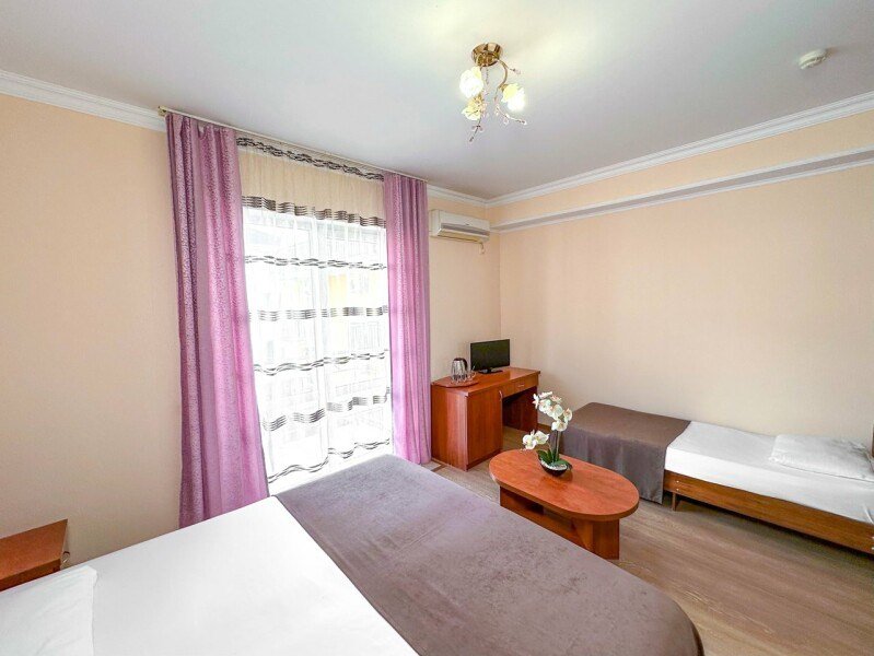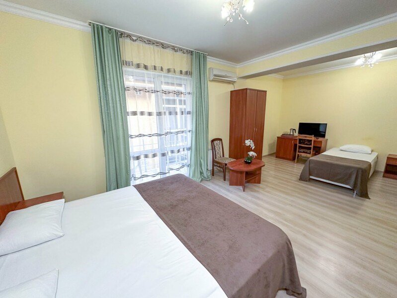 Комфорт с балконом - двуспальная кровать и односпальная кровать позволят с комфортом разместиться семье из трех человек. Без доплаты возможно размещение одного ребенка возрастом до 4 лет включительно при размещении на спальных местах с родителями. В номере собственный санузел с душевой кабиной. Номер оснащен индивидуальным кондиционером и имеет доступ к сети Wi-Fi. В номере есть все необходимое для полноценного отдыха или для работы. Мини холодильник, телевизор, электрочайник, бокалы, фен, шкаф для одежды, рабочий стол, журнальный столик. В санузле косметические принадлежности: мыло, шампунь, гель для душа, туалетная бумага, комплект полотенец (для ног, лицевые и банные). Расположены номера со второго по четвертый этаж. Напольное покрытие – ламинат. В номере есть балкон.Услуги и удобства