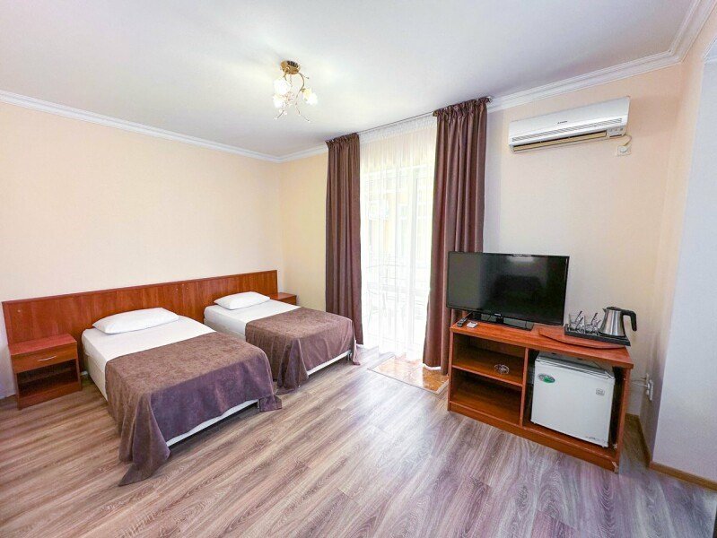 телевизор, Wi-Fi, кондиционер, фен, санузел, банные полотенца, тапочки, гигиенические средства, две односпальные или большая двуспальная кровать, тумбы, шкаф для одежды, зеркало, чайник, раковина, отопление, душ, вид во двор, ламинат, стаканы, стул, стол, мини-холодильник, номер для некурящих, уборка номера, мылоВ гостиничном номере