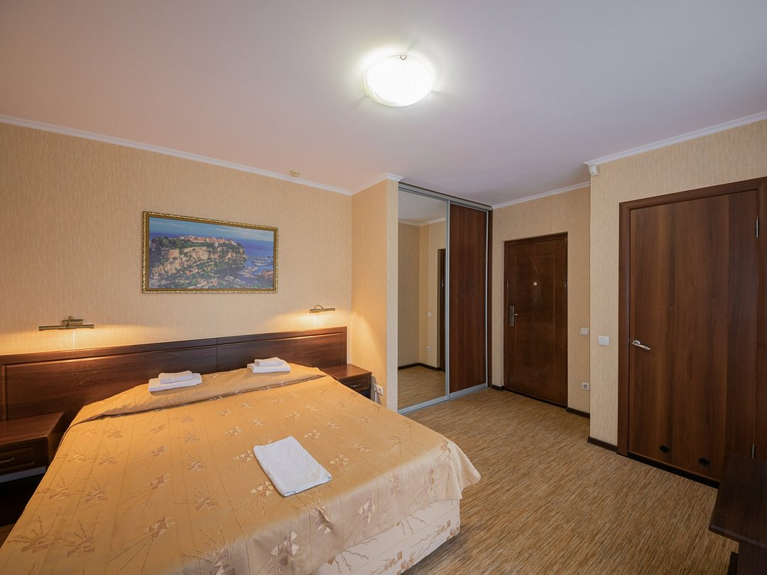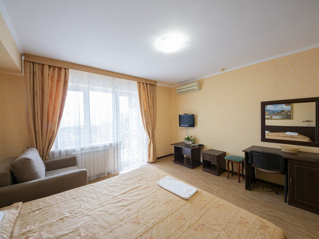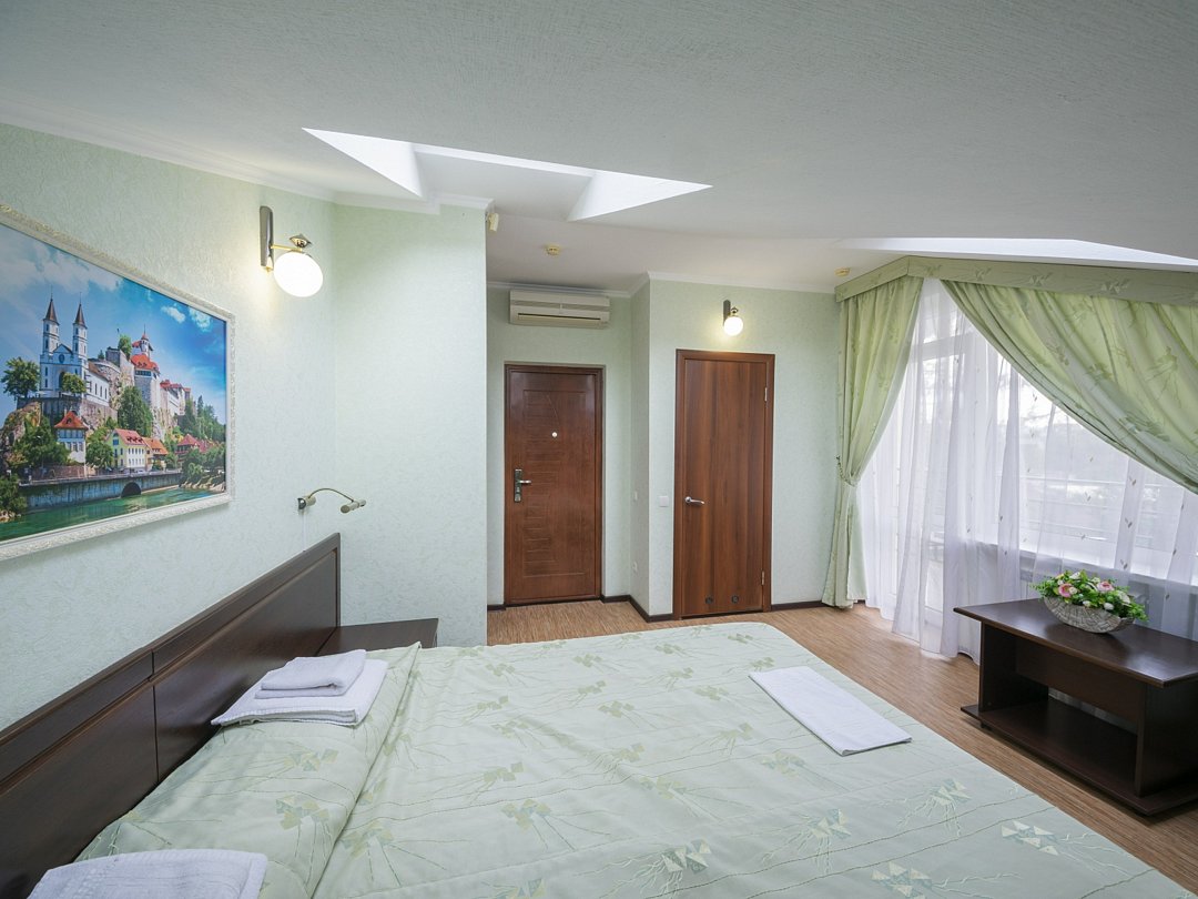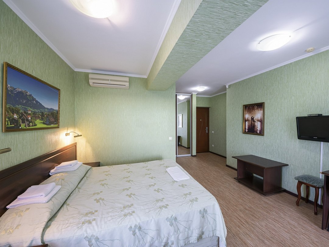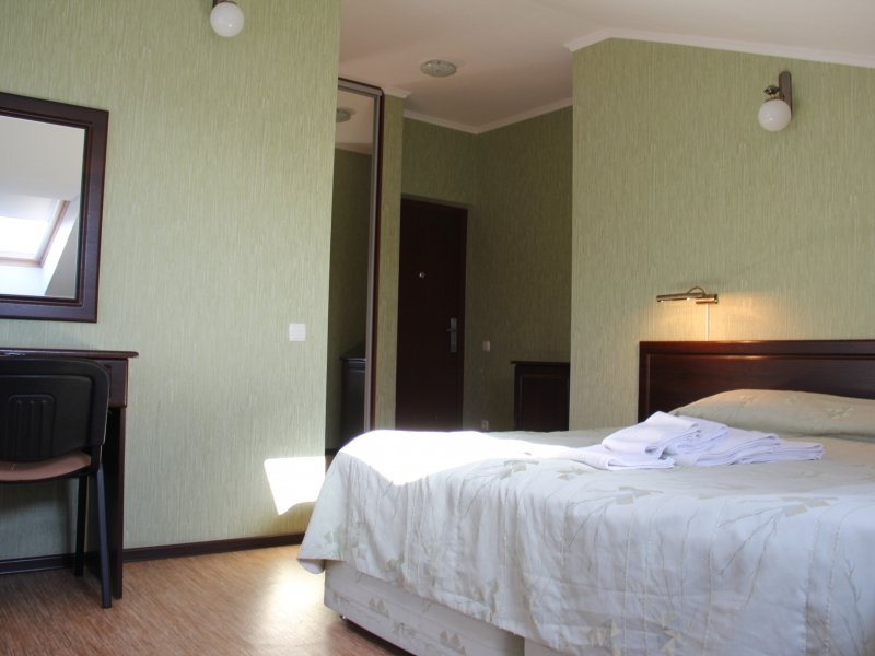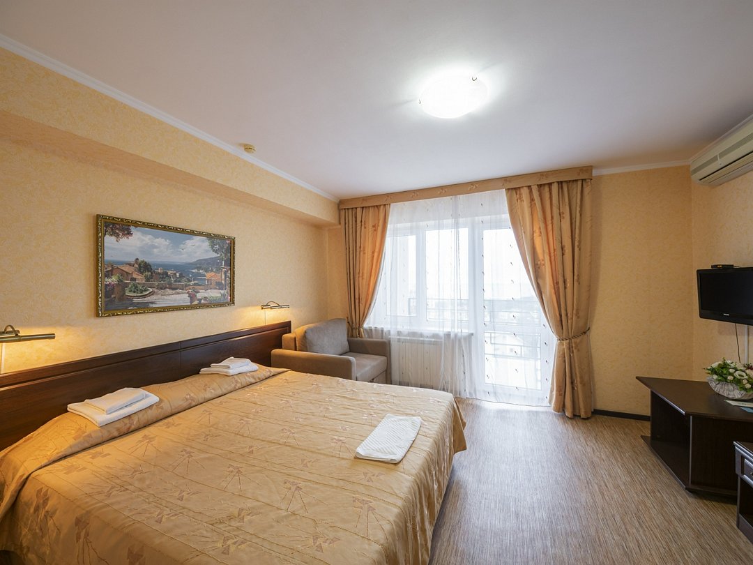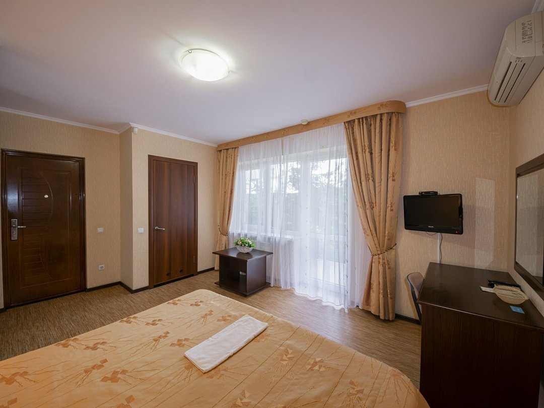 Двухместный стандарт предусматривает двухместную кровать (180х200) или две раздельные кровати (90х200). Все удобства в номере. Балкон 8 м2 в двух номерах и 3 м2 в одном номере этой категории. Wi-Fi бесплатно, электрочайник, посуда, приборы, телевизор, сплит, сейф, фен, все в номере.В номере