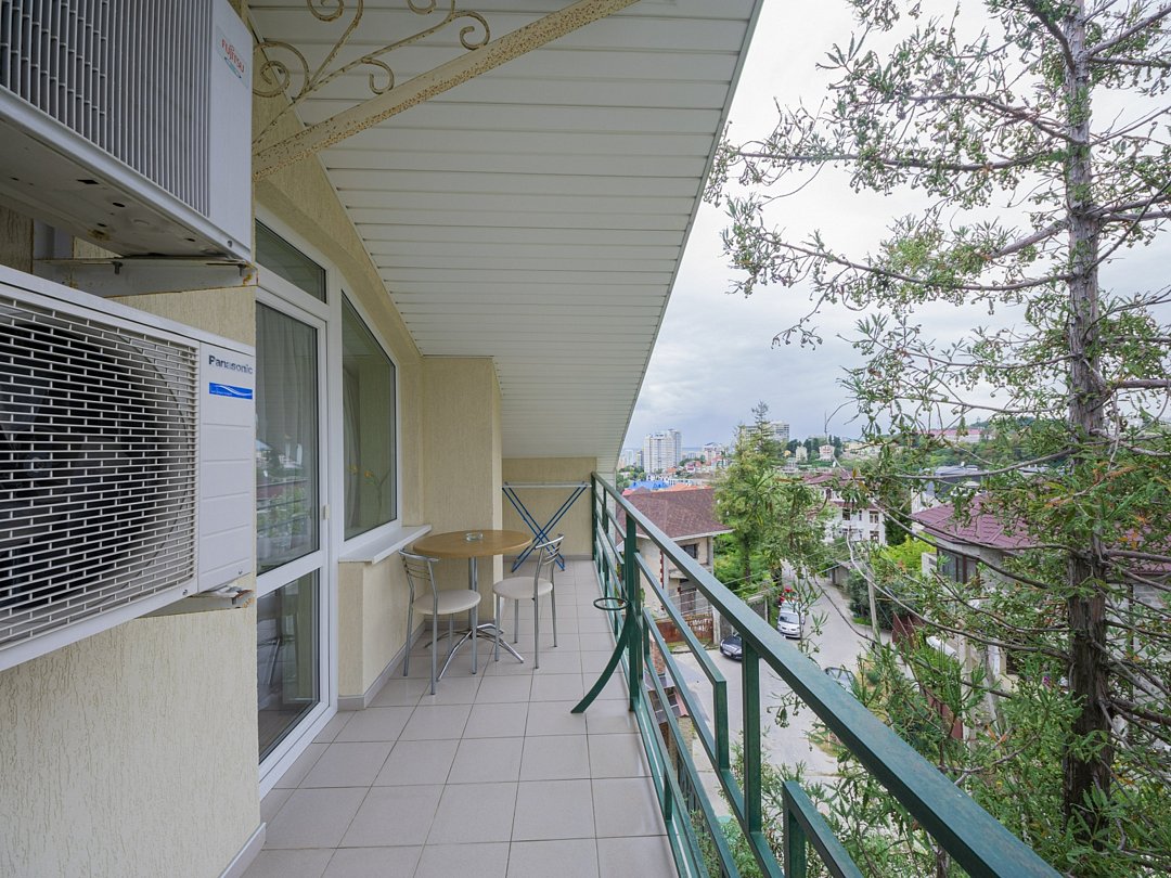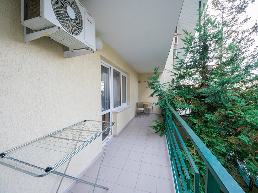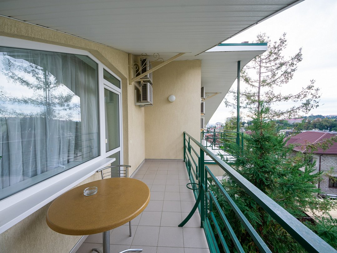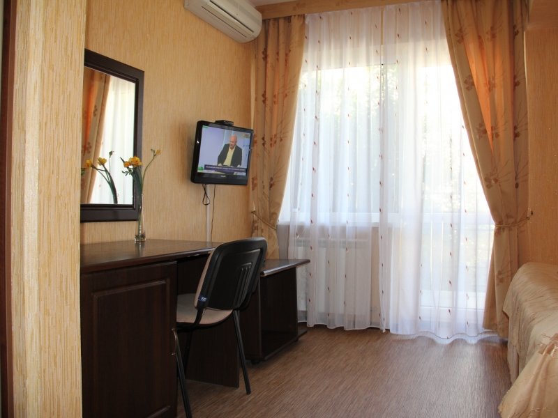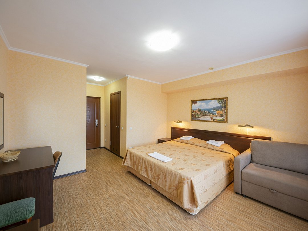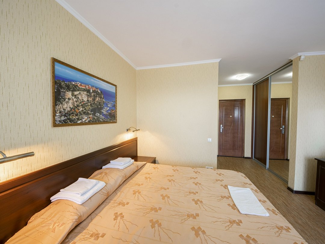 Двухместный стандарт с видом на море предусматривает двухместную кровать (180х200) или две раздельные кровати (90х200) с возможностью размещения дополнительного спального места на кресло-кровати (90х200) . Все удобства в номере. Балкон с видом на море площадью 3 м2 в двух номерах, в третьем угловом номере два балкона площадью 3 и 9 м2. Wi-Fi бесплатно, электрочайник, посуда, приборы, телевизор, сплит, сейф, фен, все в номере.В номере