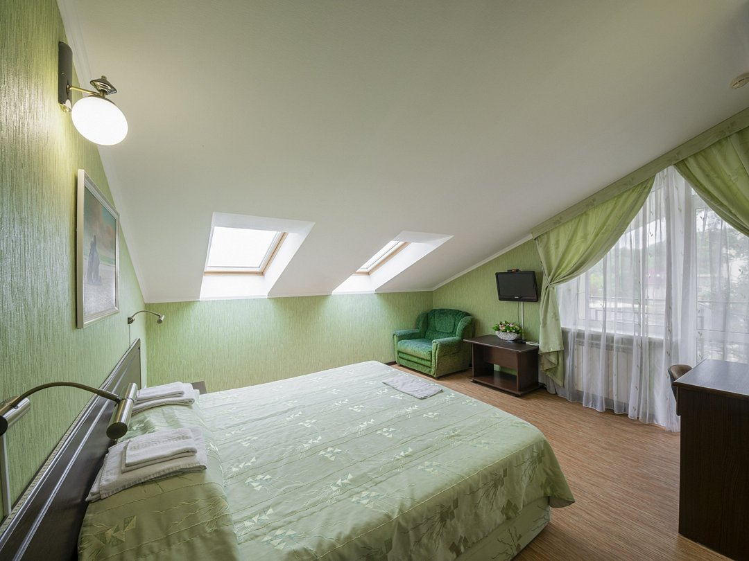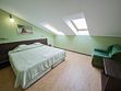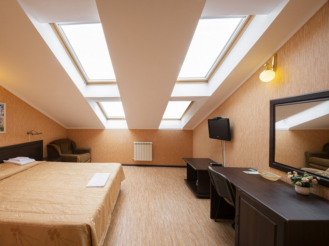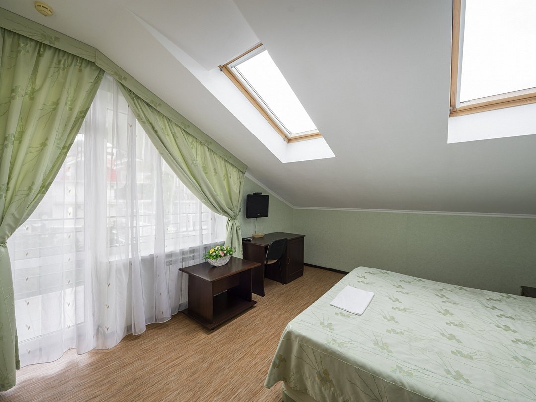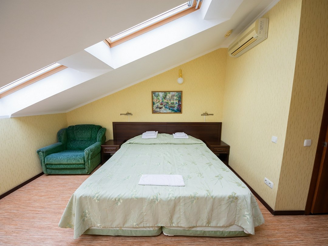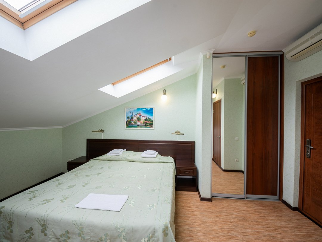 Двухместный эконом предусматривает двухместную кровать (180х200) или две раздельные кровати (90х200). Все удобства в номере. Балкона нет, в номере 4 мансардных окна. Wi-Fi бесплатно, электрочайник, посуда, приборы, телевизор, сплит, сейф, фен, все в номере. Из трех номеров этой категории в двух предусмотрена возможность размещения платного (500 руб/сут.) дополнительно места в виде кресло-кровати (90х200)В номере