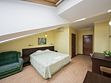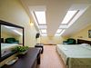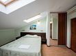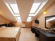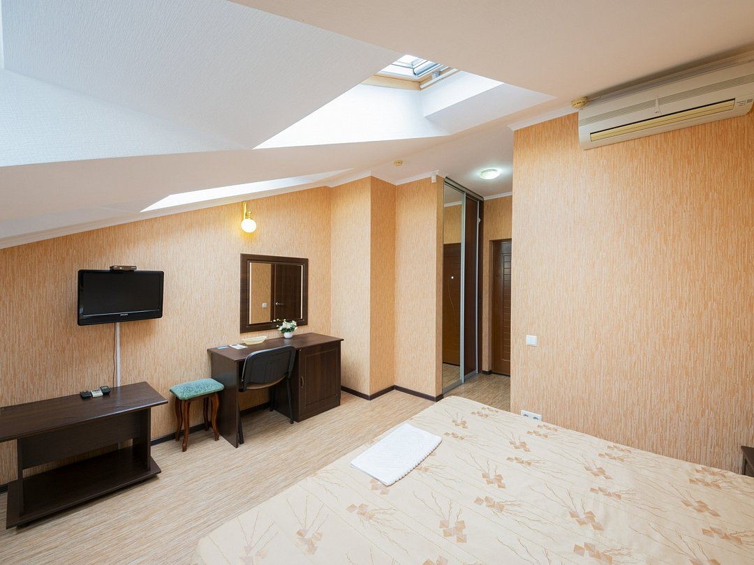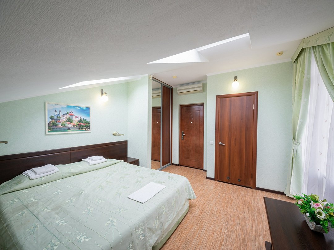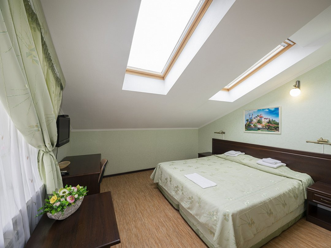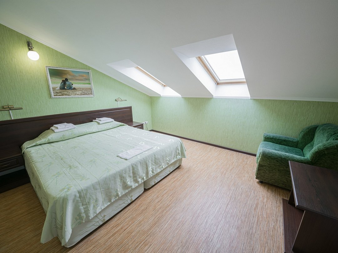 Двухместный эконом предусматривает двухместную кровать (180х200) или две раздельные кровати (90х200). Все удобства в номере. Балкона нет, в номере 4 мансардных окна. Wi-Fi бесплатно, электрочайник, посуда, приборы, телевизор, сплит, сейф, фен, все в номере. Из трех номеров этой категории в двух предусмотрена возможность размещения платного (500 руб/сут.) дополнительно места в виде кресло-кровати (90х200)В номере