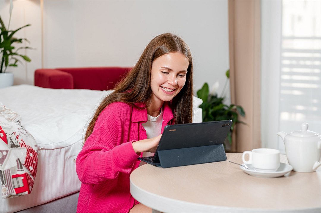 Просторный светлый номер с большой гостиной зоной и отдельной спальней, оборудованный кухонным модулем с набором посуды для возможности самостоятельного приготовления пищи, располагает всем необходимым для комфортного пребывания маломобильных гостей: