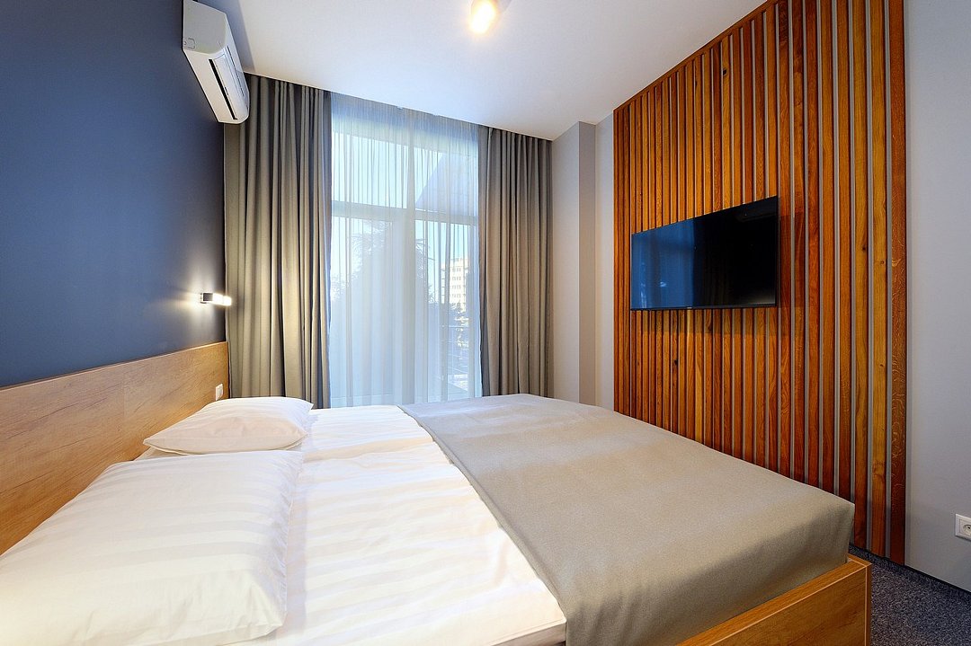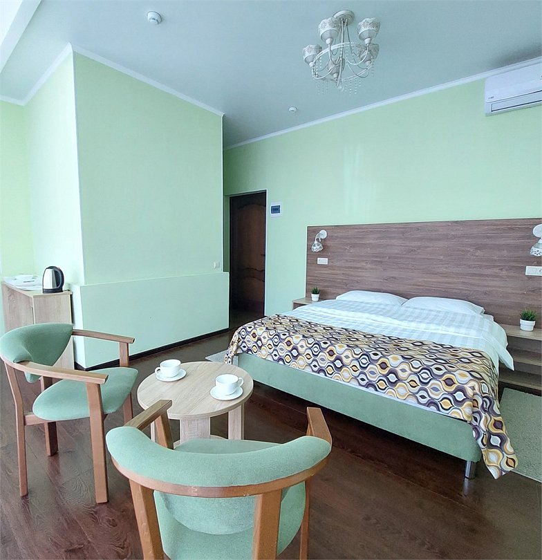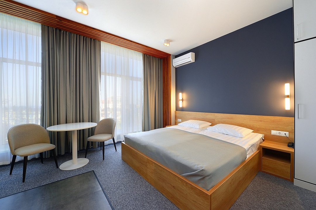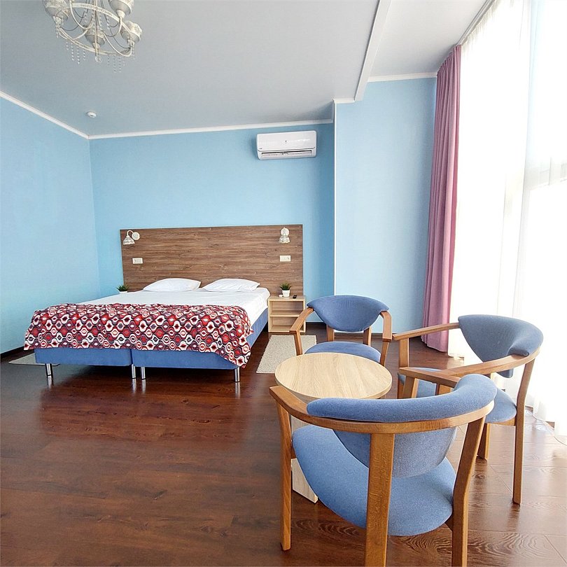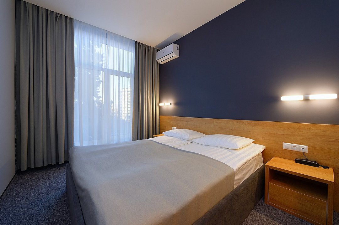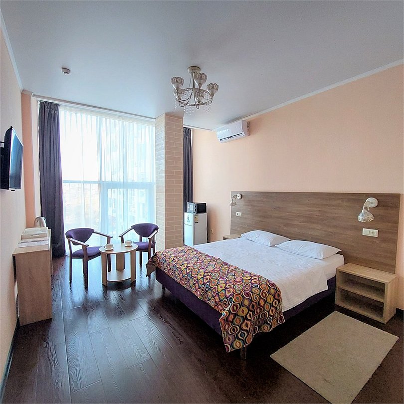 Категория номера представлена в трёх цветовых вариантах: "ПЕРСИК", "ГОЛУБОЙ", "ОЛИВКОВЫЙ". Все номера с панорамными окнами, с видом: частично море/горы/город.Услуги и удобства