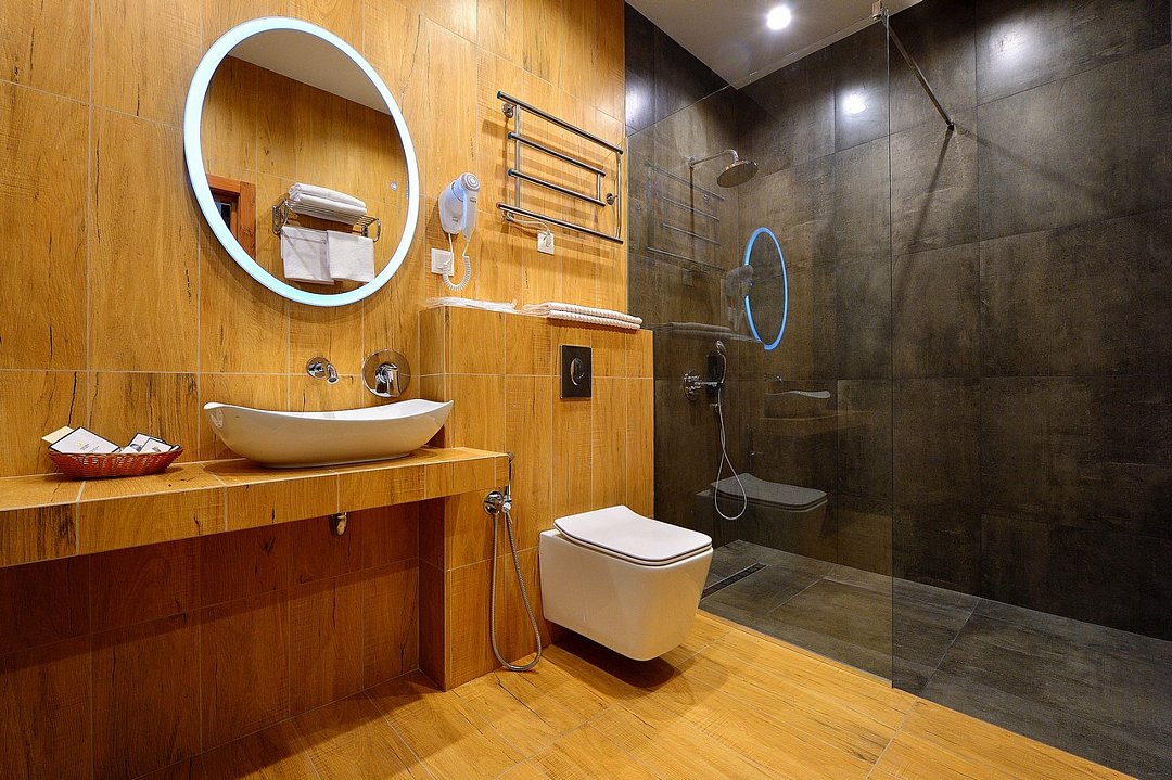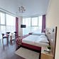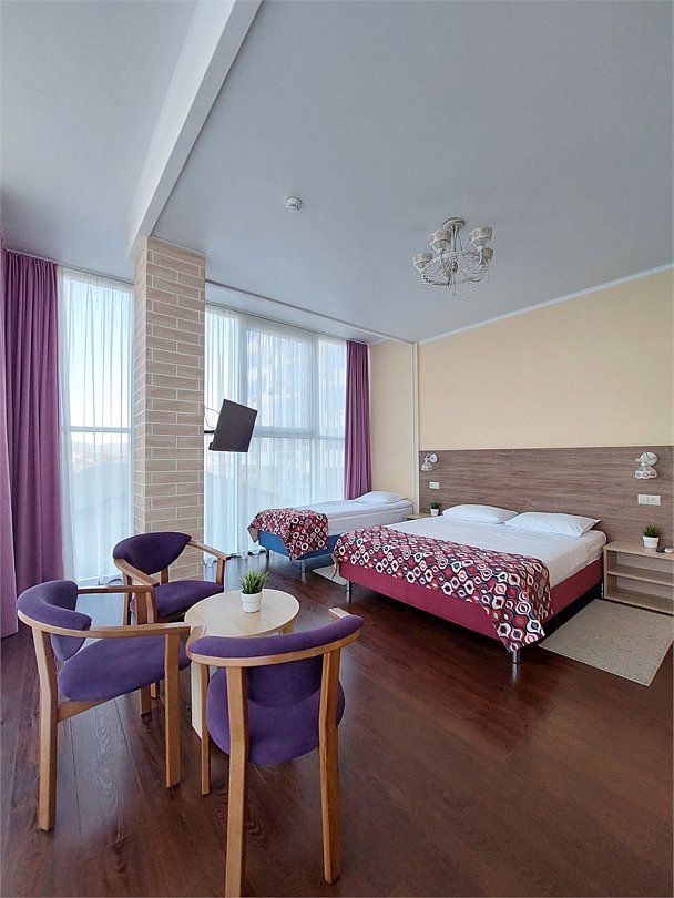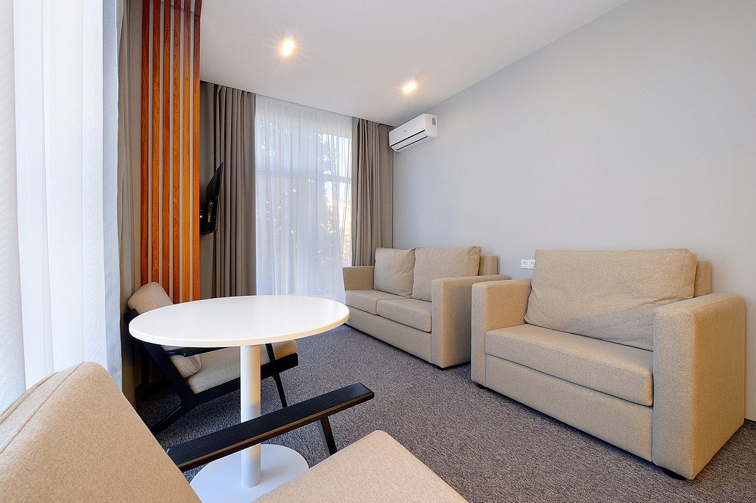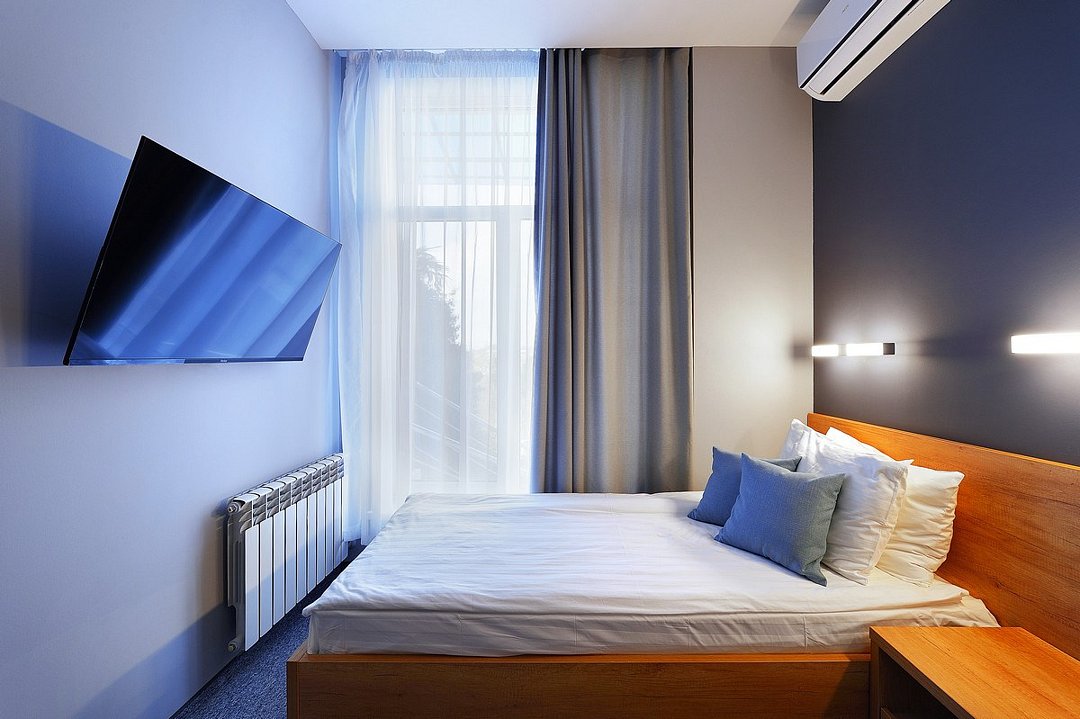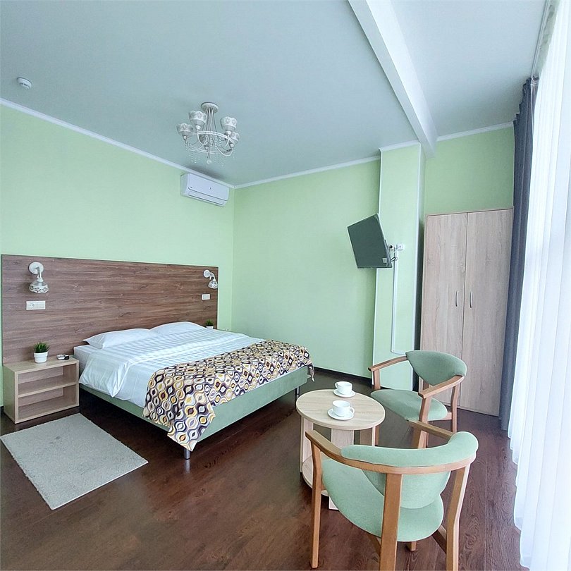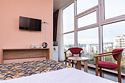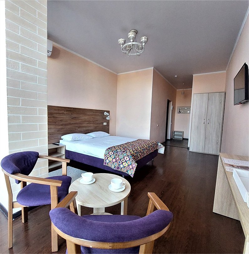 Категория номера представлена в трёх цветовых вариантах: "ПЕРСИК", "ГОЛУБОЙ", "ОЛИВКОВЫЙ". Все номера с панорамными окнами, с видом: частично море/горы/город.Услуги и удобства