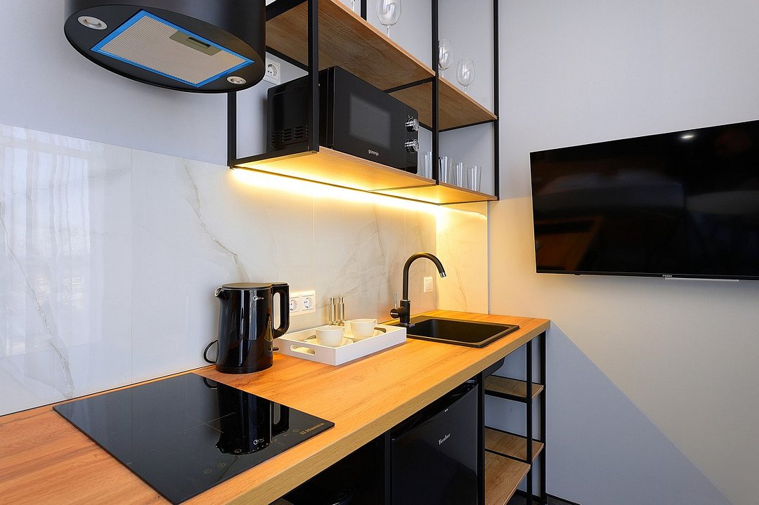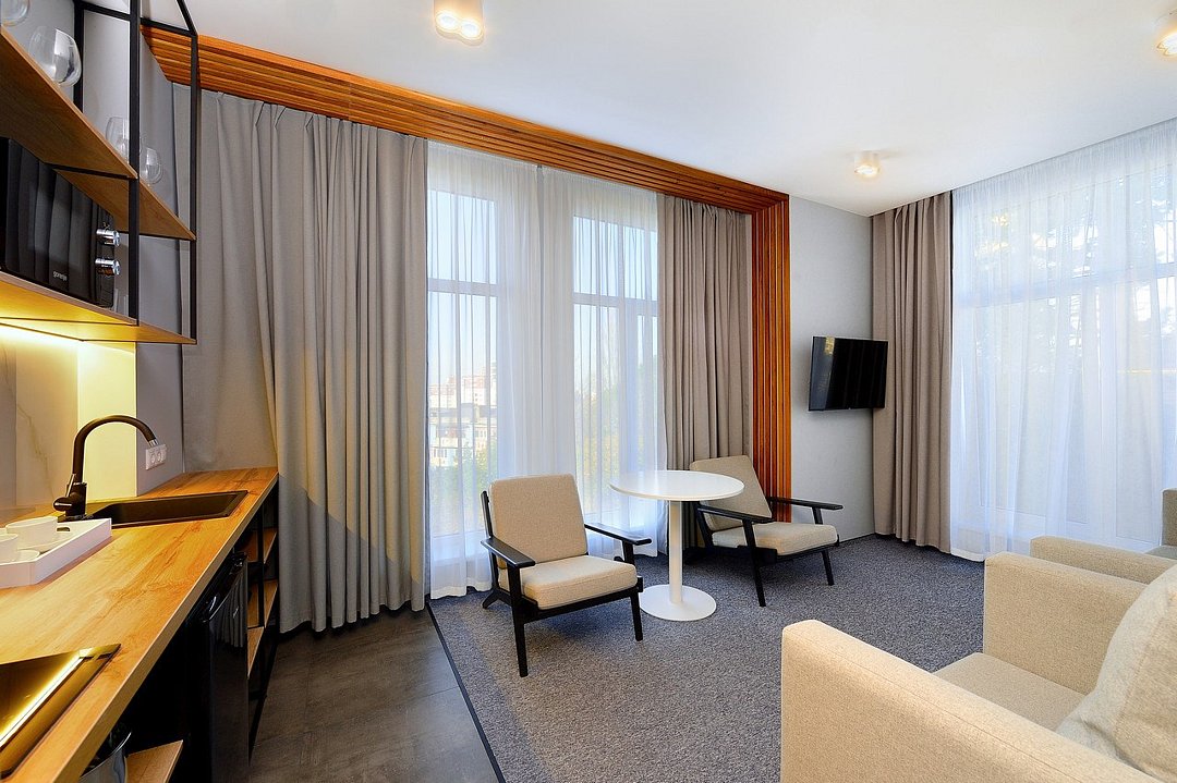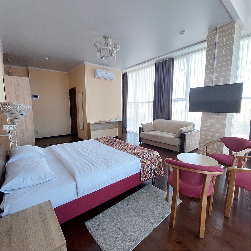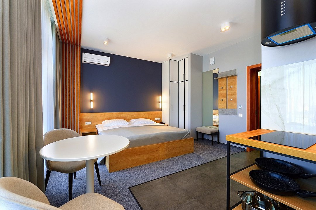 Однокомнатный эргономичный номер с дизайнерским интерьером и видом на море. Апартаменты выполнены в стиле LOFT , в приятных бежевых оттенках и совмещают в себе кухонную зону и спальню. Ванная комната оснащена душевой кабиной. В номере есть все необходимое для комфортного проживания: оборудованная кухонная зона, мини холодильник, варочная поверхность, СВЧ печь, чайник, необходимый набор посуды); сплит-система; Wi-Fi; LCD телевизор с кабельным телевидением; электронный сейф-бокс; телефон; ванная комната с душевой кабиной; фен и косметические принадлежности; халат и тапочки.Услуги и удобства
