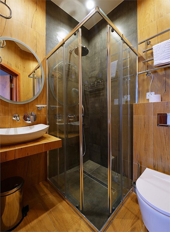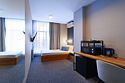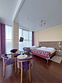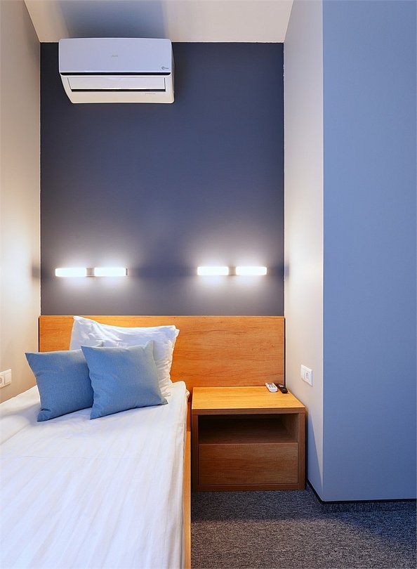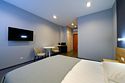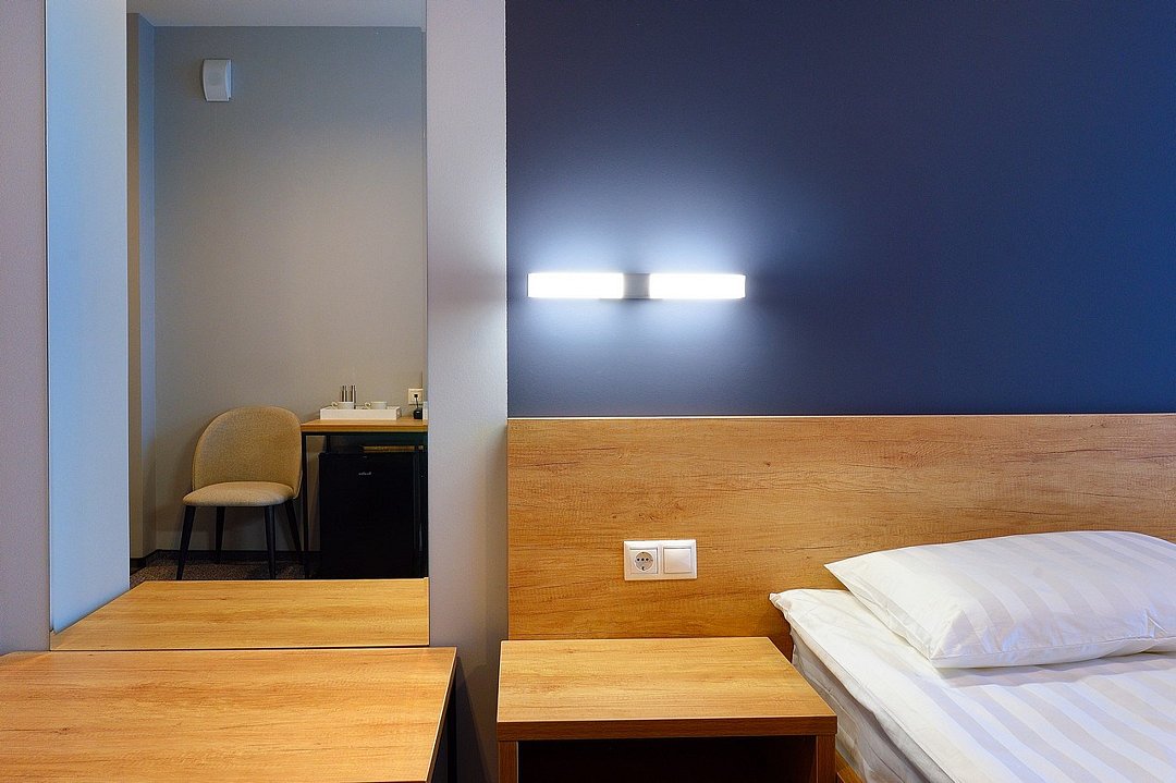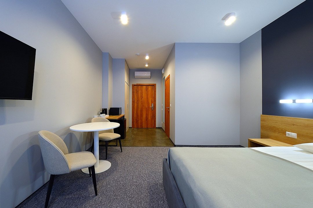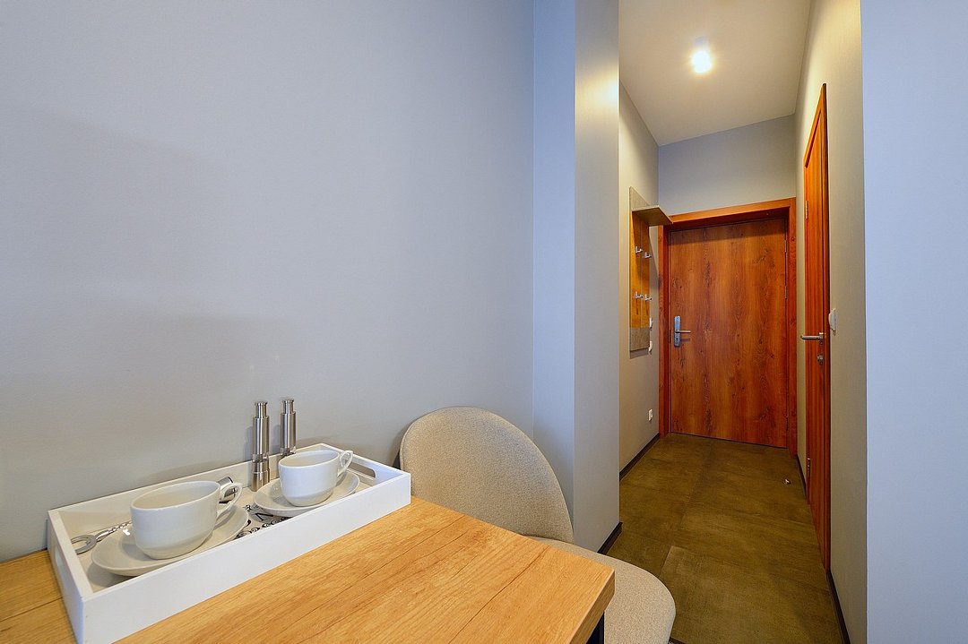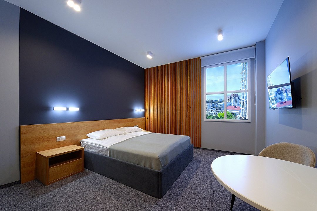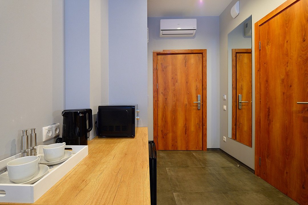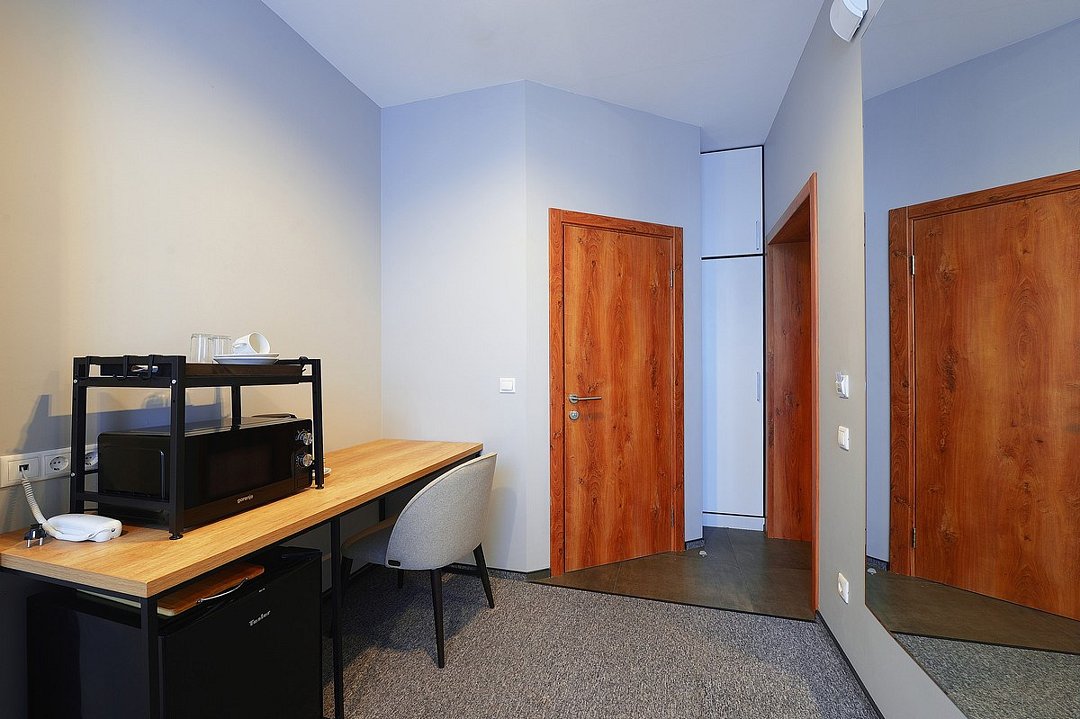 Однокомнатный эргономичный номер без окон, тихий и уютный. Апартаменты выполнены в стиле LOFT, приятных бежевых оттенках и совмещают в себе спальню и ванную комнату с душевой кабиной. В номере есть все необходимое для комфортного проживания: мини холодильник, СВЧ печь, чайник, необходимый набор посуды); сплит-система; Wi-Fi; LCD телевизор с кабельным телевидением; телефон; ванная комната с душевой кабиной; фен и косметические принадлежности; халат и тапочки.Услуги и удобства
