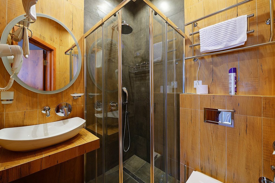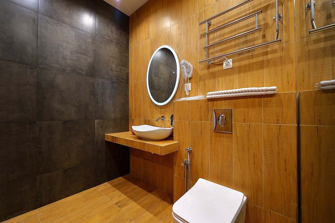 Однокомнатный эргономичный номер , тихий и уютный. Апартаменты выполнены в стиле LOFT, приятных бежевых оттенках и совмещают в себе спальню и ванную комнату с душевой кабиной. В номере есть все необходимое для комфортного проживания: двухспальная кровать, мини холодильник, СВЧ печь, чайник, необходимый набор посуды); сплит-система; Wi-Fi; LCD телевизор с кабельным телевидением; телефон; ванная комната с душевой кабиной; фен и косметические принадлежности; халат и тапочки.Услуги и удобства