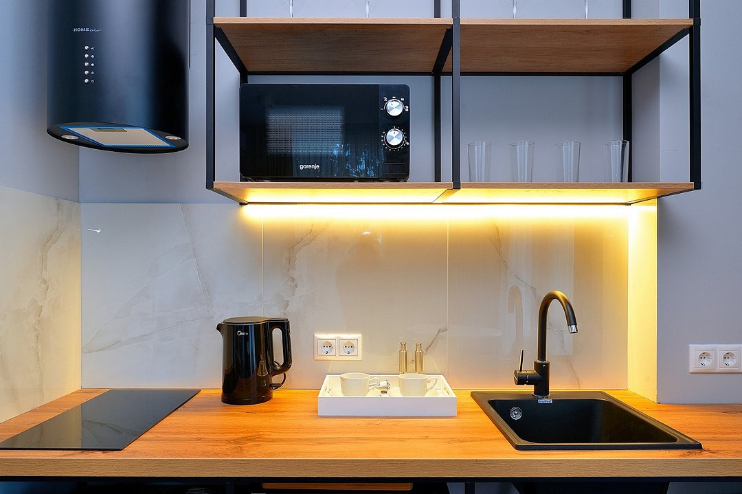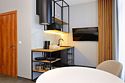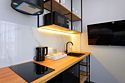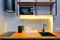 Однокомнатный эргономичный номер с окном, тихий и уютный. Апартаменты выполнены стиле LOFT, в приятных бежевых оттенках и совмещают в себе кухонную зону, спальню и ванную комнату с душевой кабиной. В номере есть все необходимое для комфортного проживания: мини холодильник, СВЧ печь, чайник, необходимый набор посуды; сплит-система; Wi-Fi; LCD телевизор с кабельным телевидением; телефон; ванная комната с душевой кабиной; фен и косметические принадлежности; халат и тапочки.Услуги и удобства