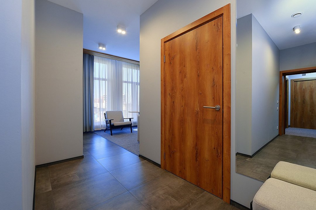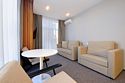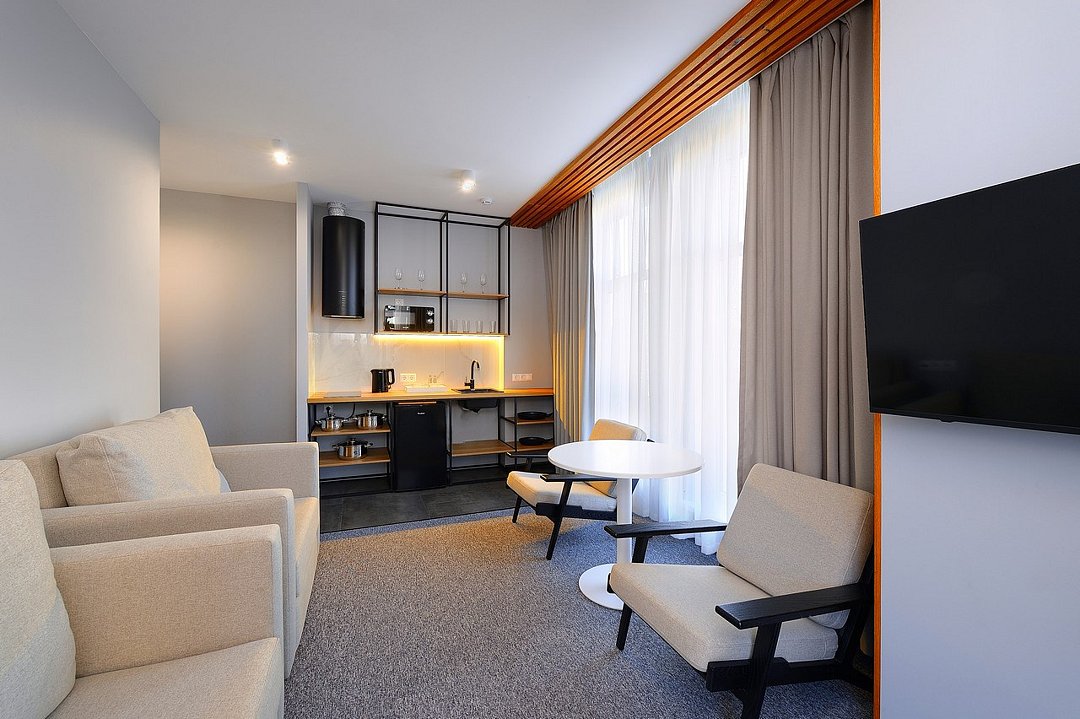 Двух-комнатные апартаменты класса "Люкс" с дизайнерским интерьером в стиле LOFT. Номер выполнен в приятных бежевых оттенках и совмещает в себе кухонную зону-гостиную и отдельную спальню. Ванная комната оснащена душевой кабиной. В номере есть все необходимое для комфортного проживания: оборудованная кухня мини холодильник, варочная поверхность СВЧ печь, чайник, необходимый набор посуды); сплит-система; Wi-Fi; LCD телевизор с кабельным телевидением; электронный сейф-бокс; телефон; ванная комната с душевой кабиной; фен и косметические принадлежности; халат и тапочки.Услуги и удобства