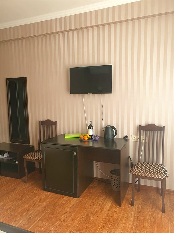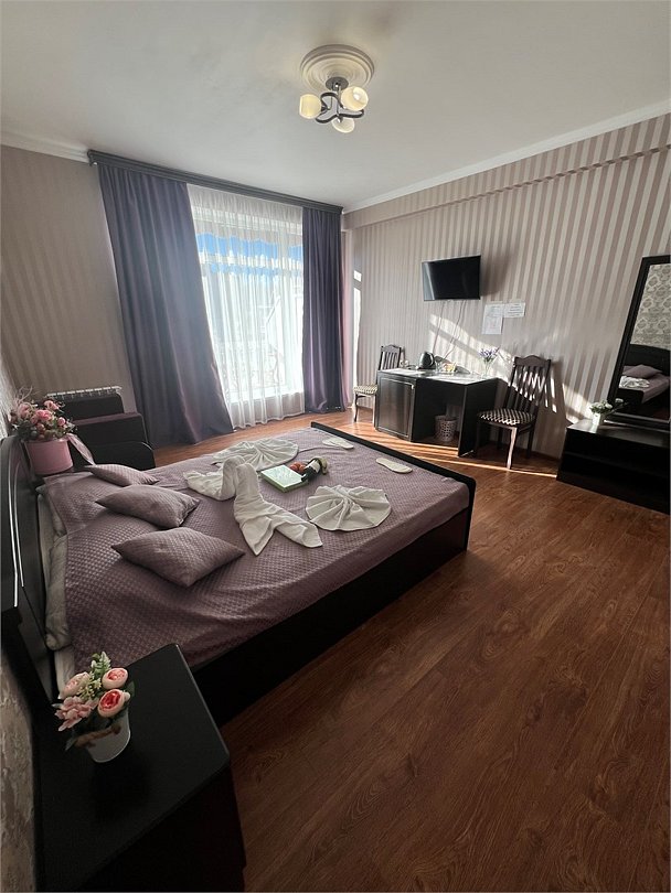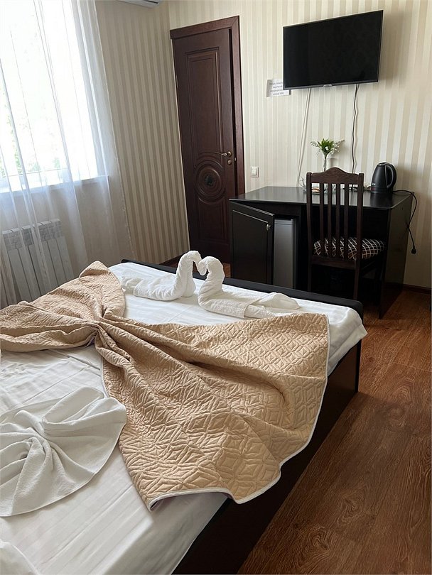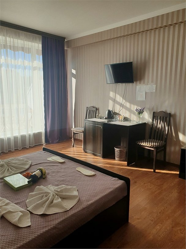 Комфортный новый номер с двуспальной кроватью и раскладным креслом,есть с шикарной террасой, где можно за столиком утром завтракать и пить кофе. А вечером наслаждаться закатом. Номер с кондиционером, телевизором, письменным столом, холодильником, стульями, чайником, своим сан.узлом с ванной, полотенцами, гигиеническими средствами.Услуги и удобства