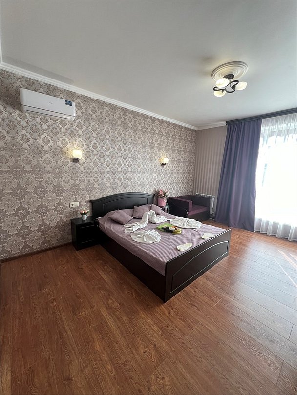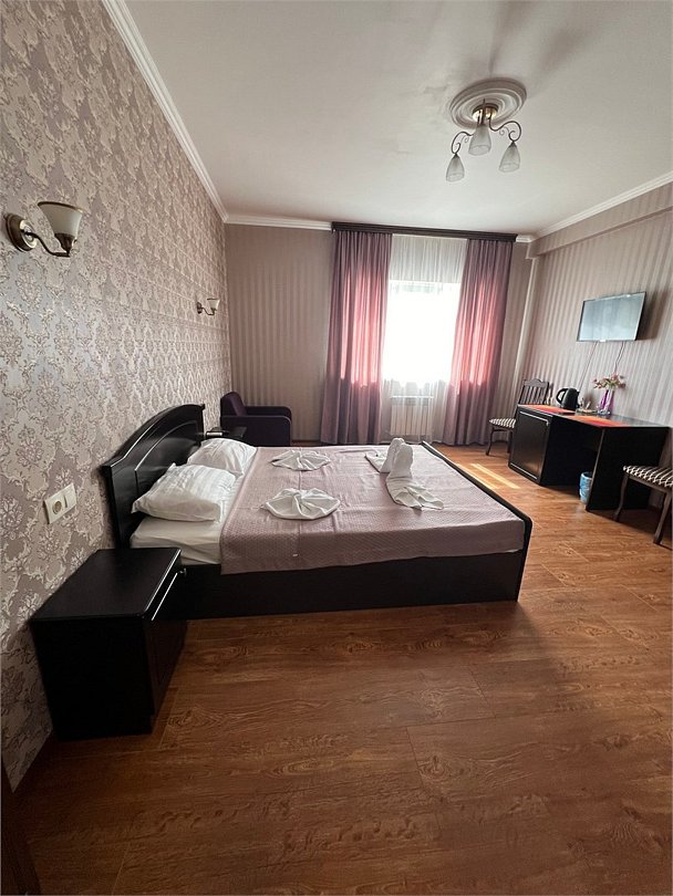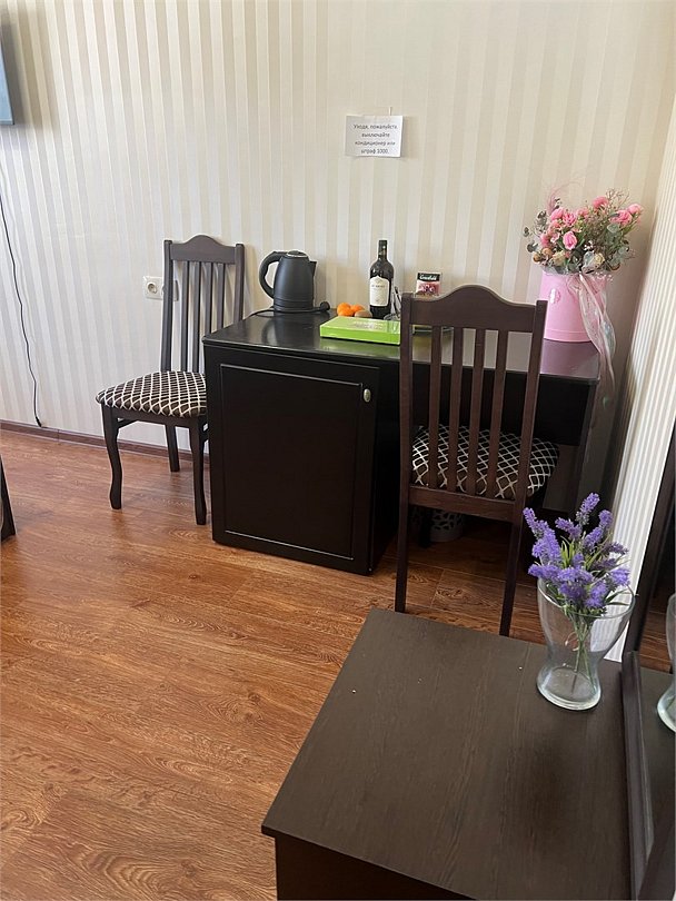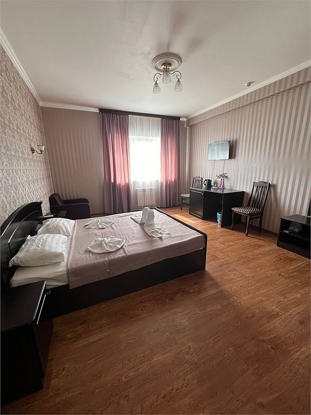 Комфортный новый номер с двуспальной кроватью. Номер с кондиционером, телевизором, письменным столом, холодильником, стульями, чайником, своим сан.узлом с ванной, полотенцами, гигиеническими средствами.Услуги и удобства