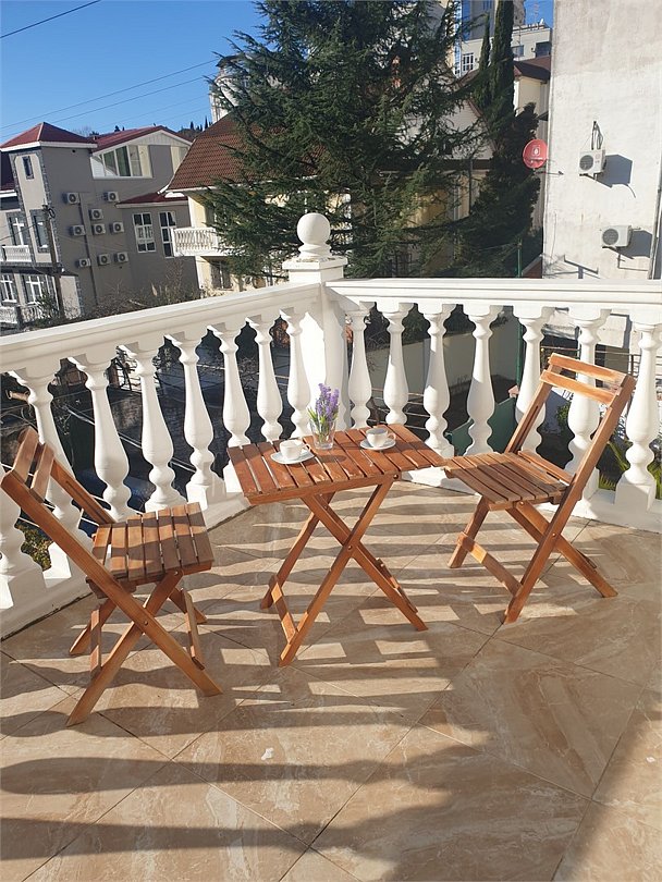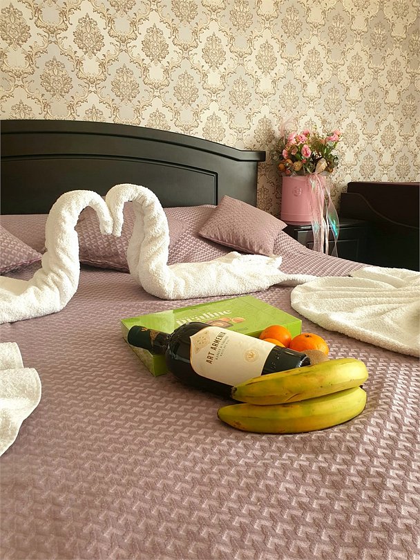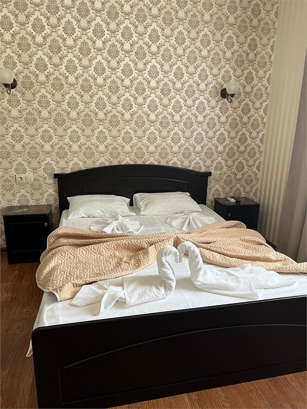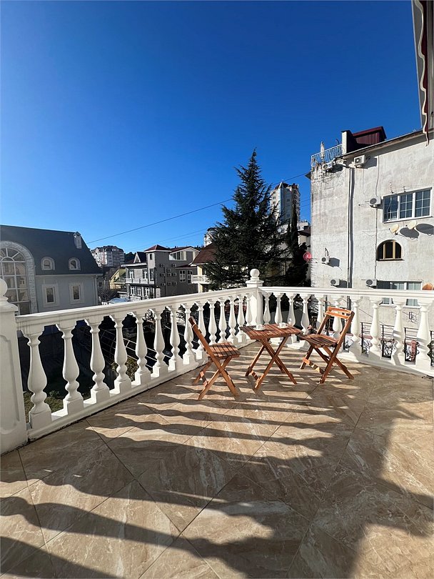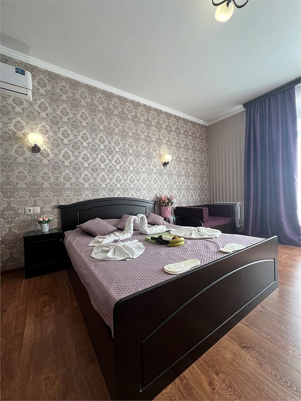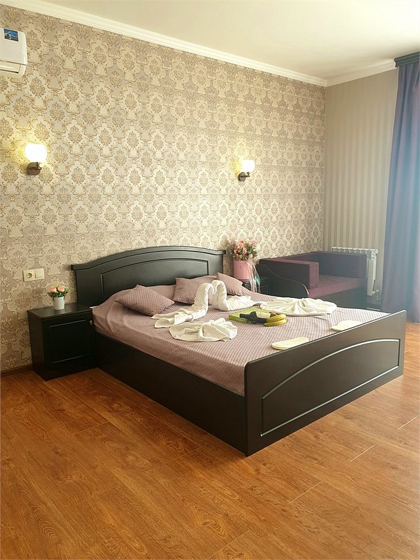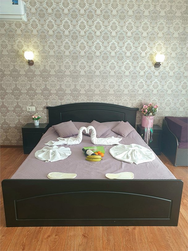 Комфортный новый номер с двуспальной кроватью и раскладным диваном, шикарной террасой, где можно за столиком утром завтракать и пить кофе. А вечером наслаждаться закатом. Номер с кондиционером, телевизором, письменным столом, холодильником, стульями, чайником, своим сан.узлом с ванной, полотенцами, гигиеническими средствами.Услуги и удобства