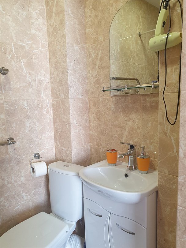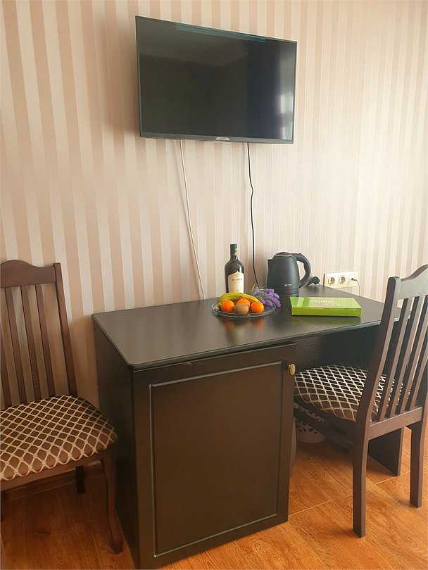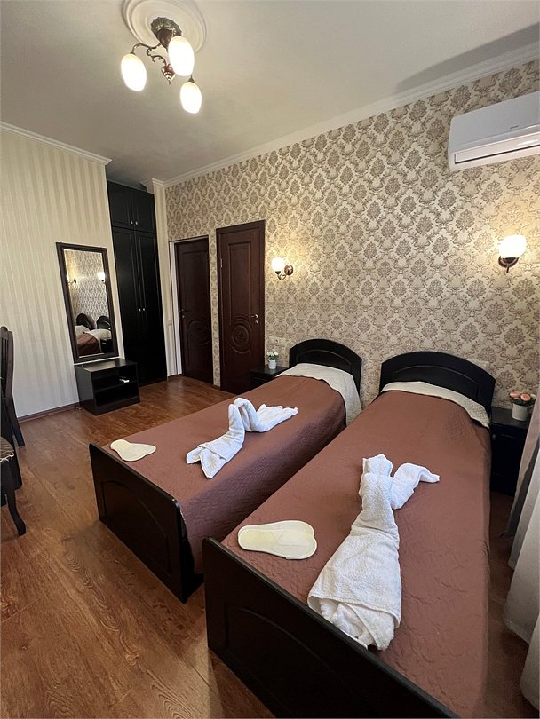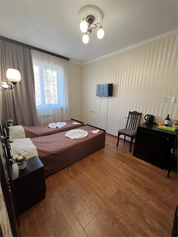 Комфортный новый номер с двумя односпальными кроватью, кондиционером, телевизором, письменным столом, холодильником, стульями, чайником, своим сан.узлом с ванной, полотенцами, гигиеническими средствами.Услуги и удобства