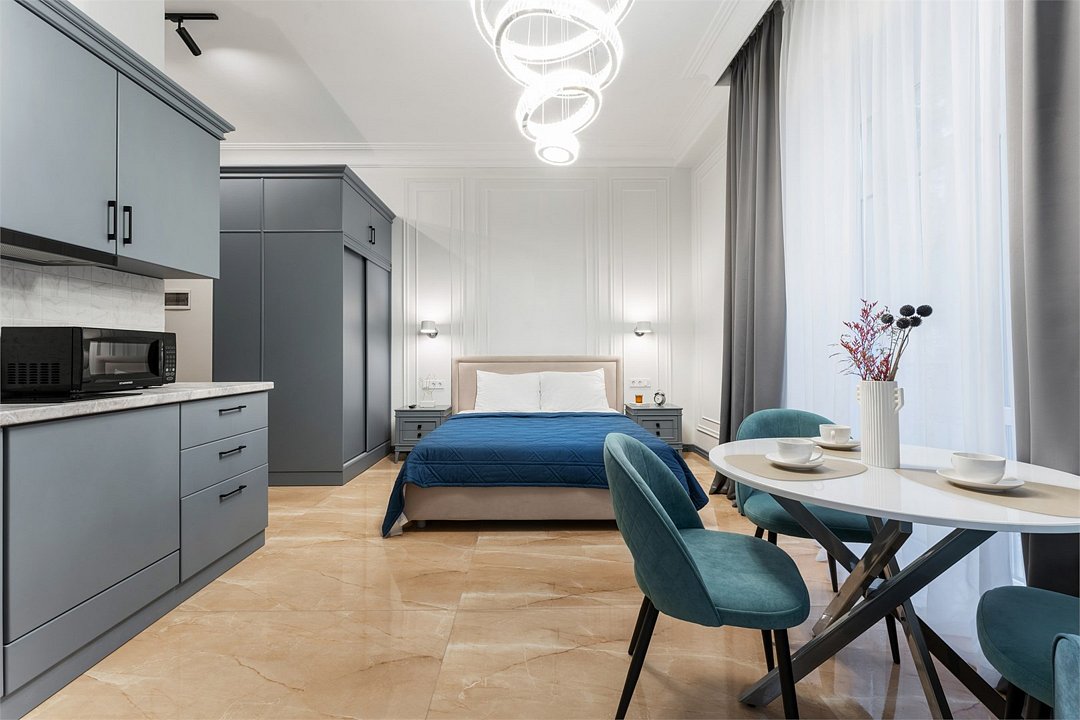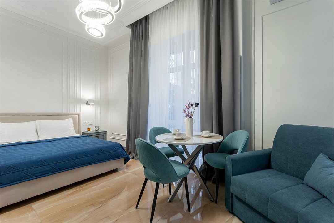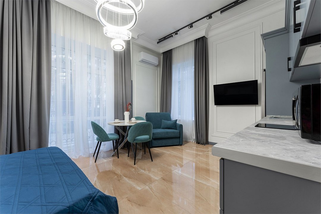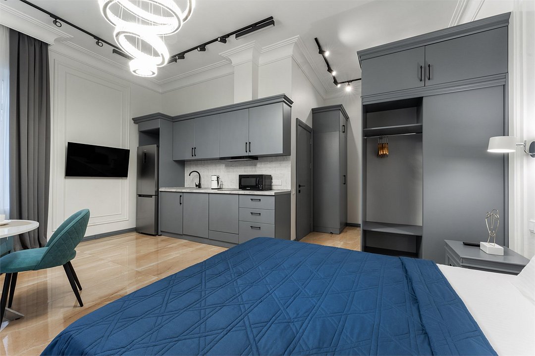 Двухместный номер с кухней-гостиной Спальная зона: Двуспальная кровать Полноценная кухонная зона с холодильником, СВЧ и всей необходимой посудой. Кондиционер, смарт-ТВ, бесплатный Wi-Fi, умная колонка Отлично подходит: Для пар и самостоятельных путешественников.Услуги и удобства
