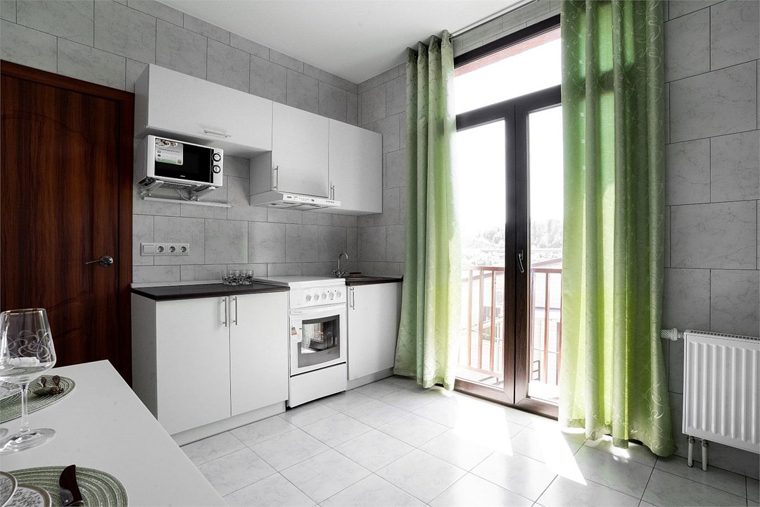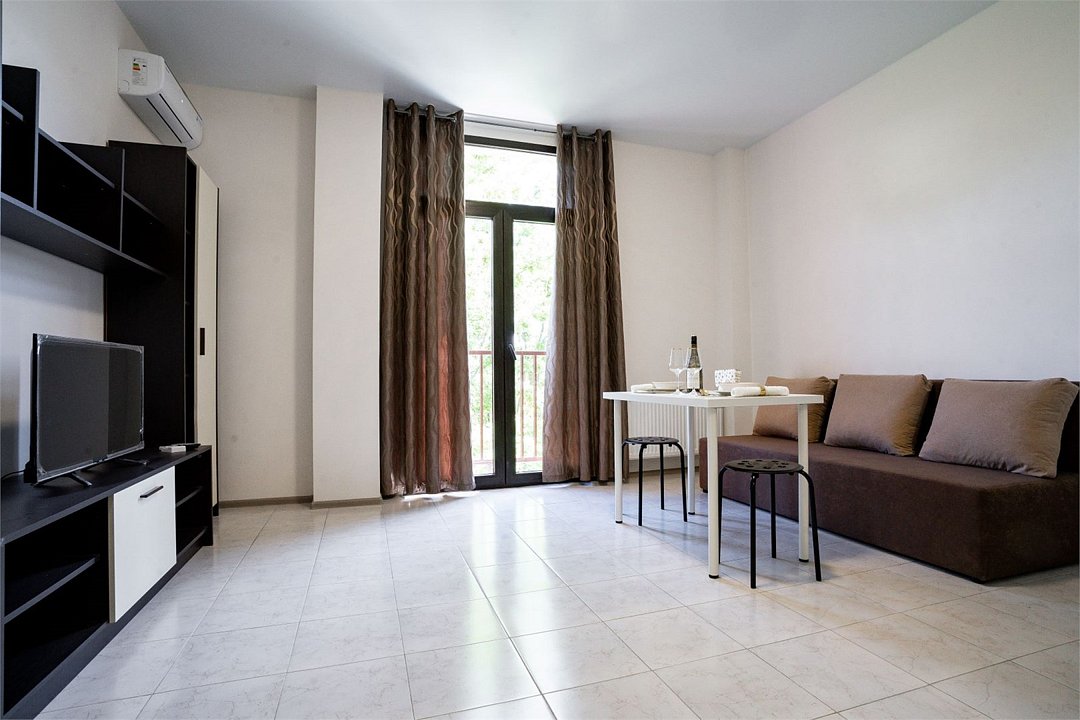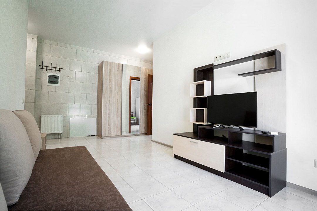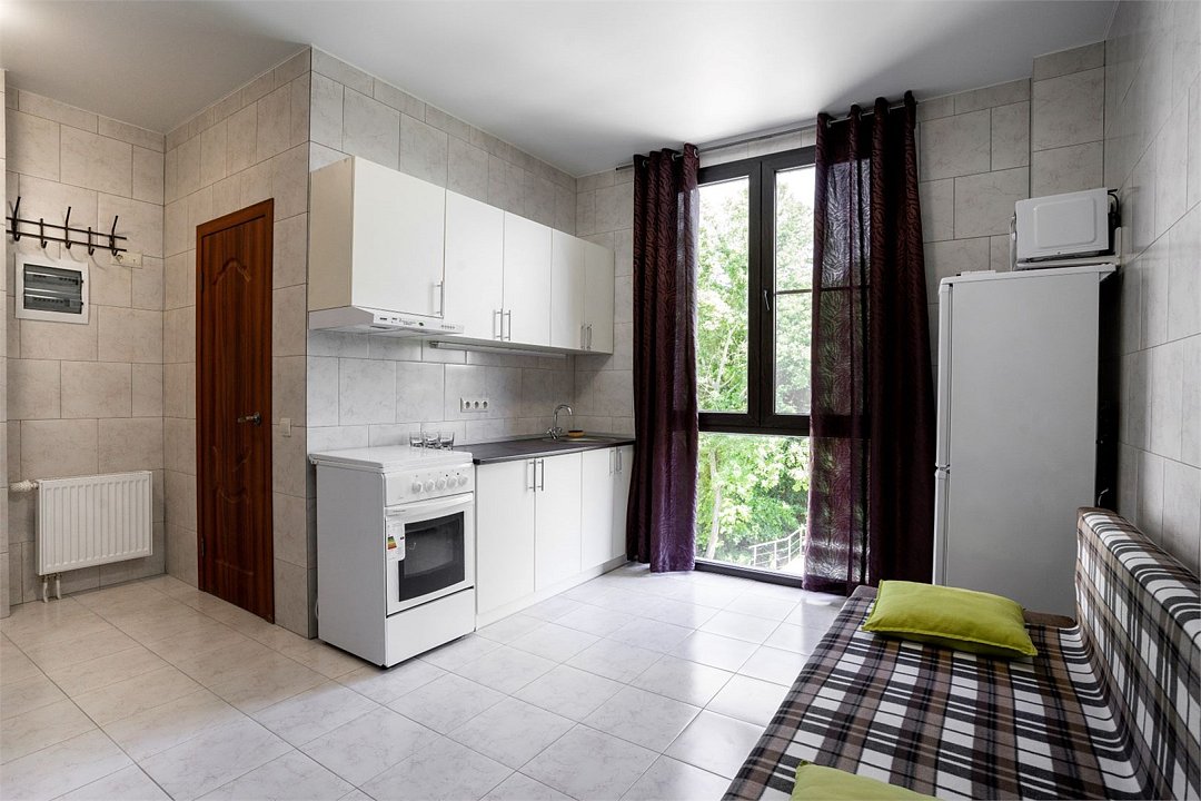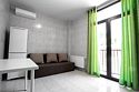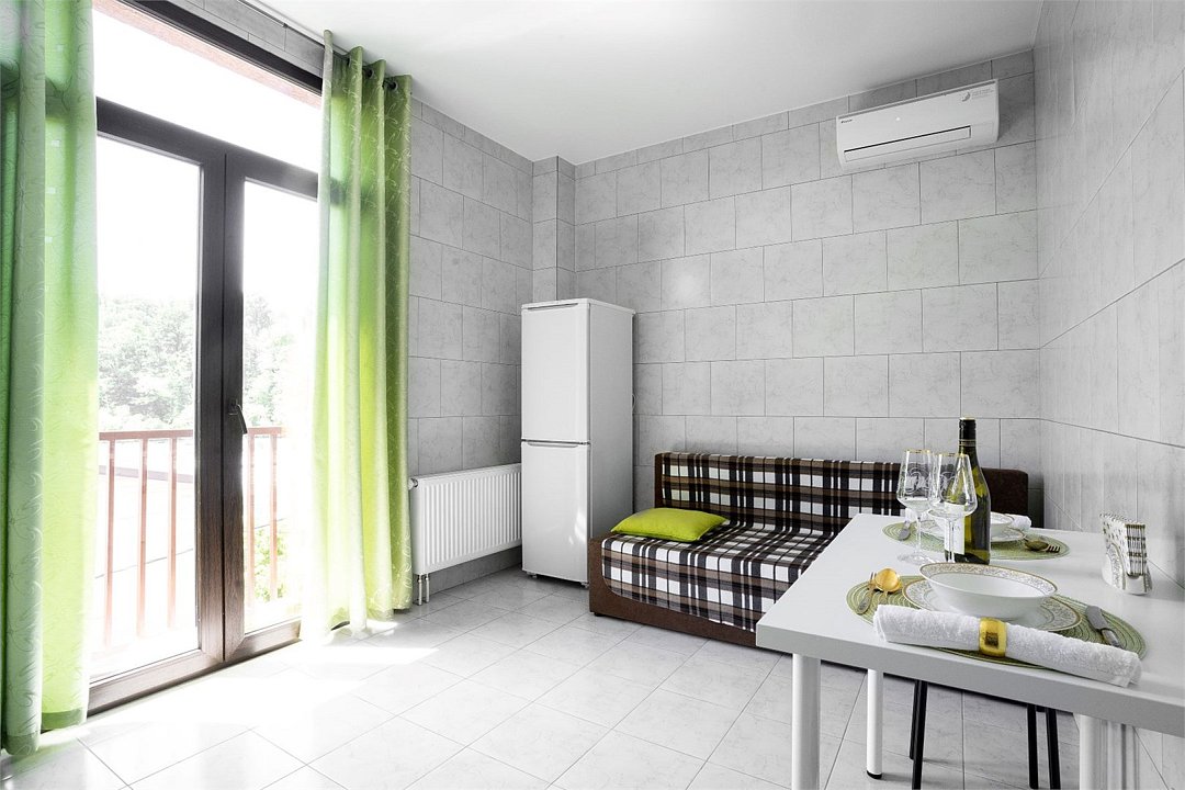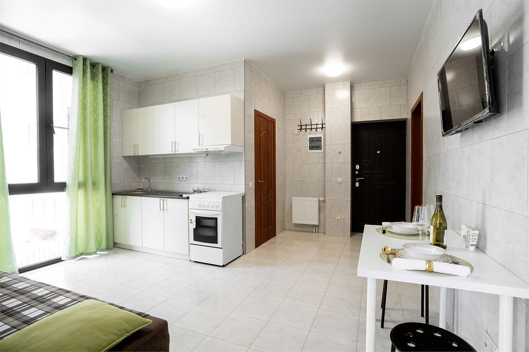 Площадь апартамента, 25 кв.м. Одна комната: кухня-студия. Выделенный с/у. Балкон, французского типа. Имеется: двуспальный раскладной диван 140*200см, мебельная стенка со шкафом и полками, кондиционер, ТВ, стол/стулья. На кухонной зоне: мойка, варочная поверхность на 2 комфорки, микроволновка, кухонная вытяжка, холодильник. Также в апартаменте имеется стиральная машина, гардеробная вешалка.Услуги и удобства
