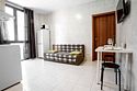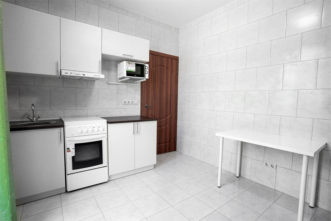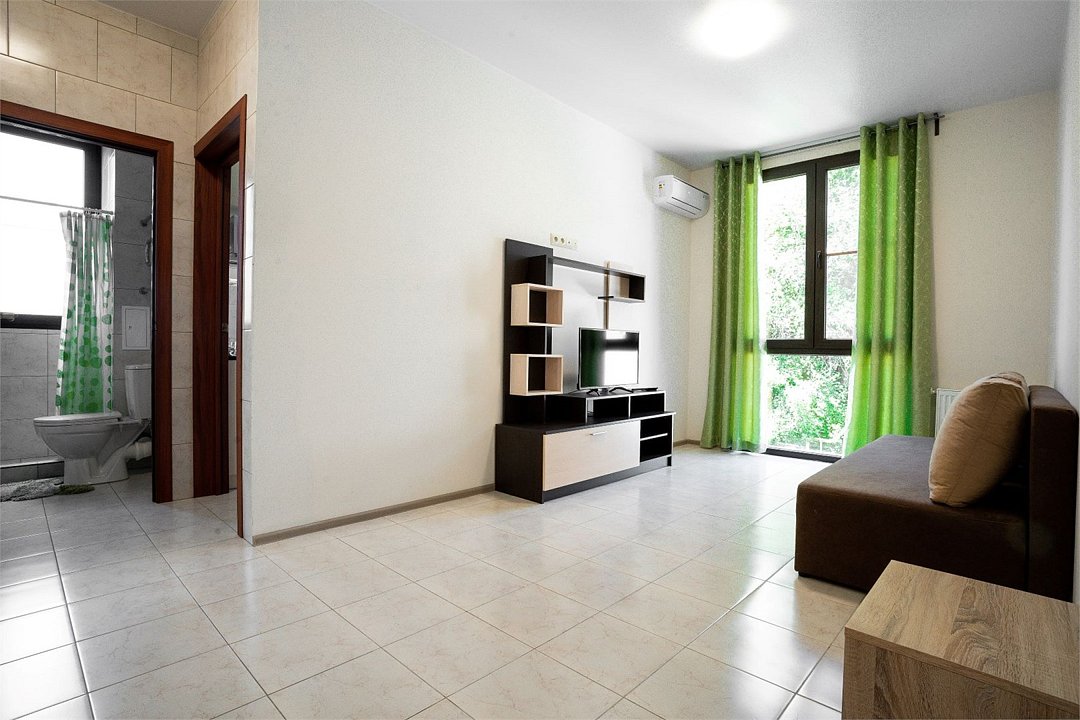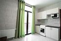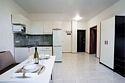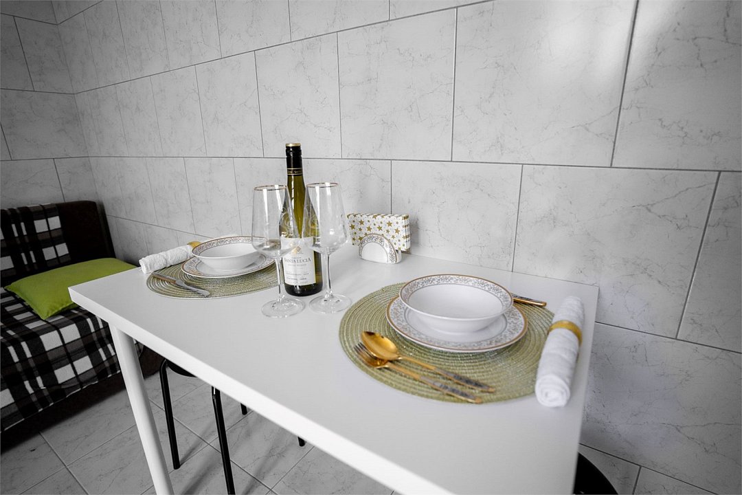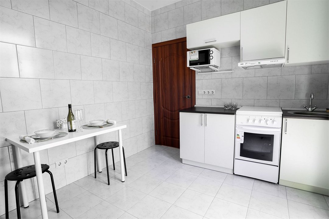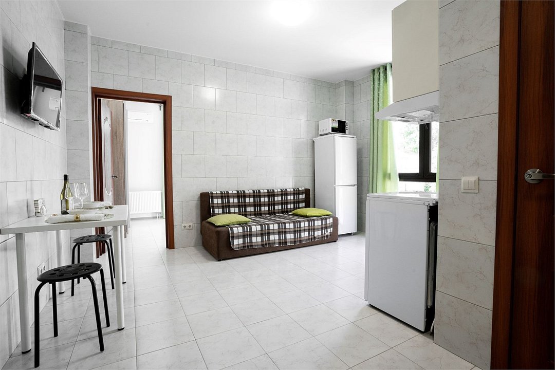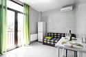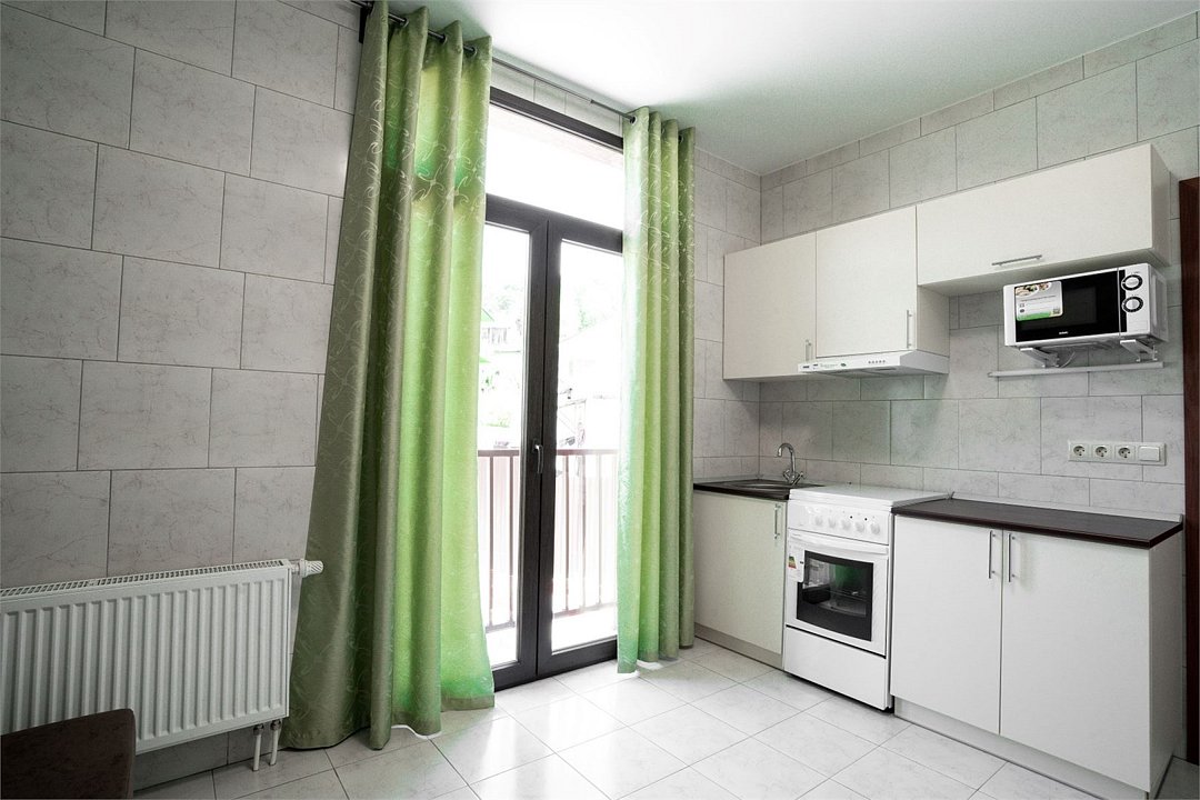 Площадь апартамента, 25 кв.м. Одна комната: кухня-студия. Выделенный с/у. Балкон, французского типа. Имеется: двуспальный раскладной диван 140*200см, мебельная стенка со шкафом и полками, кондиционер, ТВ, стол/стулья. На кухонной зоне: мойка, варочная поверхность на 2 комфорки, микроволновка, кухонная вытяжка, холодильник. Также в апартаменте имеется стиральная машина, гардеробная вешалка.Услуги и удобства